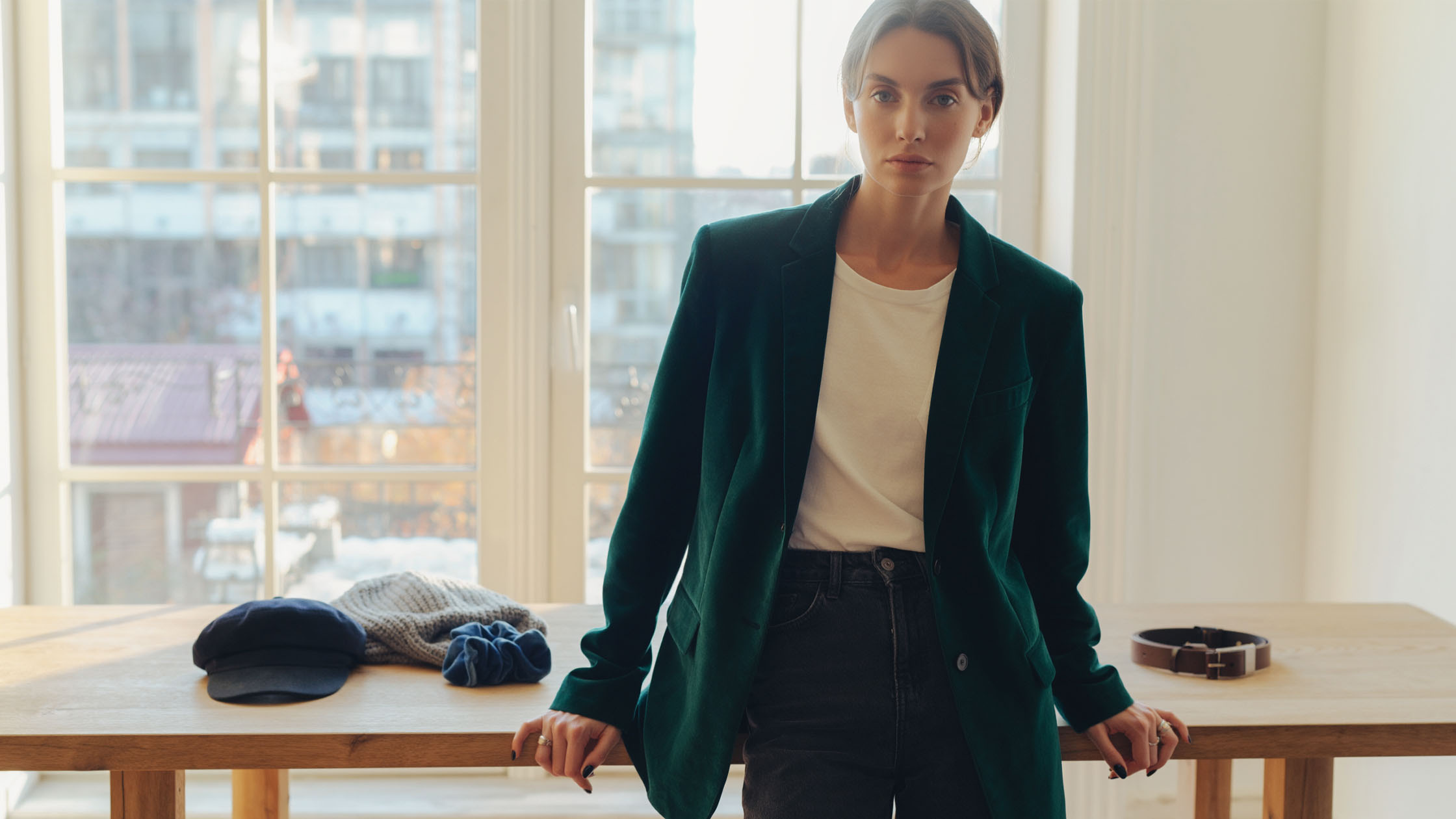 Il modo più semplice per "disincantare" il carattere serale del velluto è combinarlo con elementi tipicamente quotidiani, creando un contrasto intrigante di texture. Una giacca di velluto di cotone blu navy o bordeaux appare fenomenale in compagnia di jeans classici e grezzi in una tonalità di indaco o blu lavato. La struttura opaca e ruvida del denim offre lo sfondo perfetto per un pile morbido e lucido, creando un equilibrio perfetto per riunioni di lavoro informali o per andare al cinema. Sotto, invece di una camicia di seta o una camicetta di pizzo, vale la pena indossare una semplice maglietta di cotone di colore bianco, grigio o nero neutro. Una tale procedura riduce immediatamente la formalità dell'outfit, conferendogli un tocco moderno e urbano. Il cotone liscio della T-shirt calma la ricca struttura della giacca, rendendo il tutto pensato ma spontaneo. Questa combinazione è la quintessenza dello stile smart casual, dove comfort incontra materiali di alta qualità.