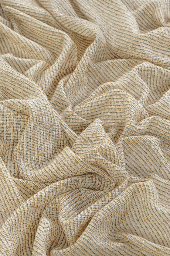 Un tessuto per abiti a trama larga come una rete destinato agli abiti primaverili, un melange di beige con oliva e arancione.