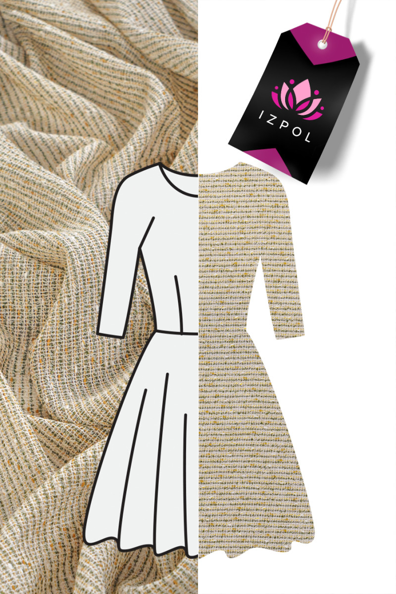 Un tessuto per abiti a trama larga come una rete destinato agli abiti primaverili, un melange di beige con oliva e arancione. Il tessuto è tessuto in viscosa e poliammide e deve essere foderato con fodera.