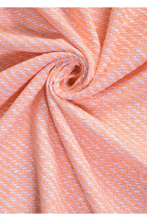 Bellissimo tessuto classico per costumi Chanel in giallo e bianco primaverile, il tutto è cucito con filo arancione scuro, che è quasi invisibile. Il tessuto è morbido, anelastico, abbastanza sottile, richiede l'uso di una fodera, selezionabile nel nostro negozio. È perfetto per set come: giacca + gonna, così come per abiti.