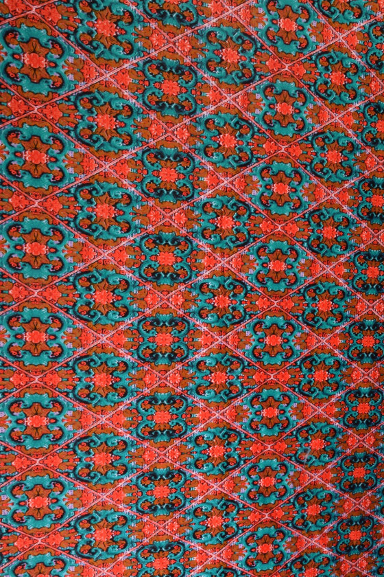 Cotone colorato, leggermente elastico. Un motivo ornamentale e colorato inserito in diamanti. Colori: turchese, marrone e rosso vivo. Una proposta per cucire abiti, gonne, pantaloni.