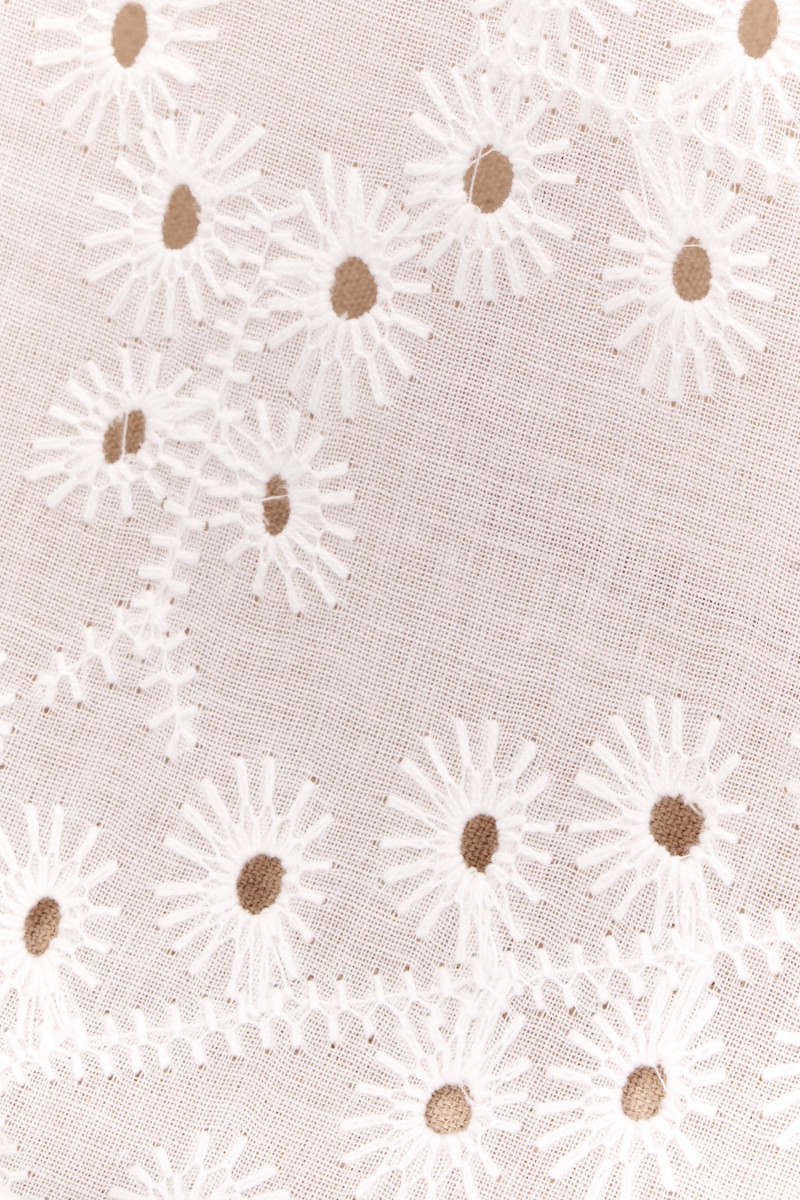 Tessuto italiano 100% cotone con ricamo Richelieu in bianco. Il motivo di minuscoli fiori disposti a forma di otto, il motivo è regolare e denso. Il tessuto è sottile, leggermente trasparente, non elastico, ha entrambi i bordi ben rifiniti. Una proposta meravigliosa e leggera per camicette, camicie e abiti.