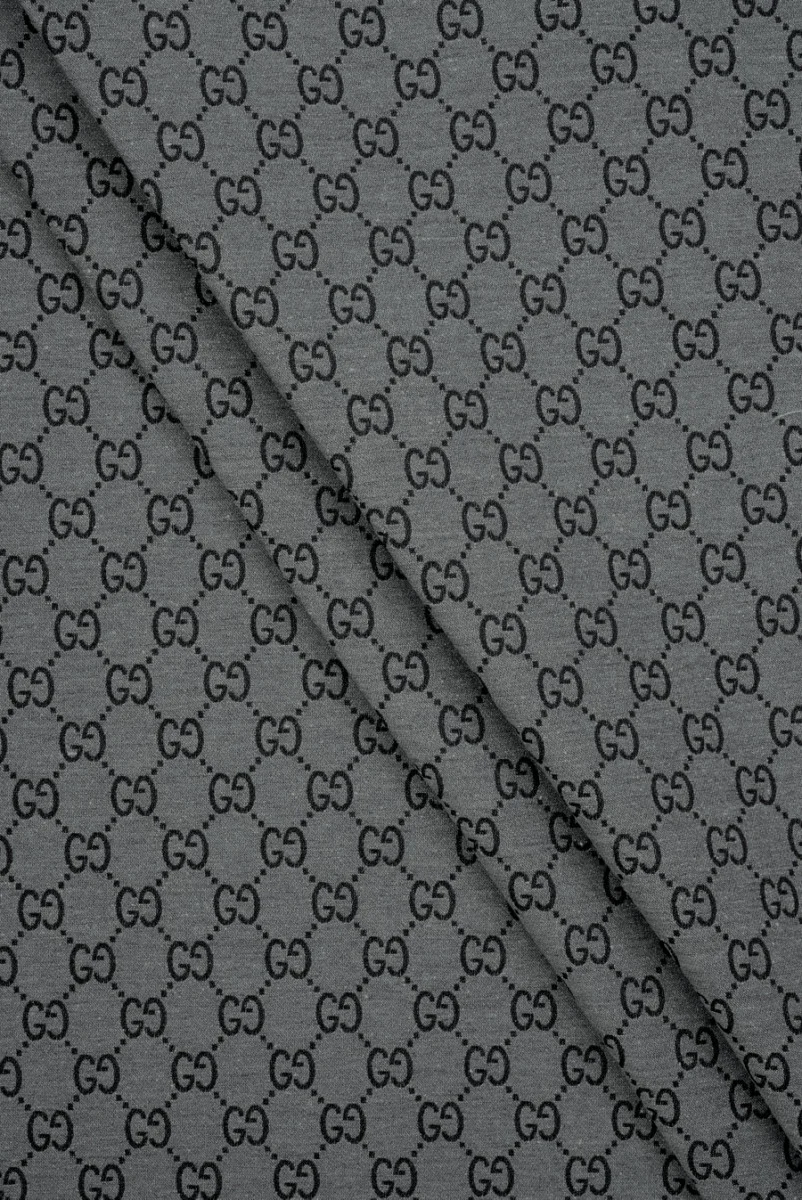Tessuto di cotone italiano con aggiunta di poliammide in grigio con un motivo ricamato di lettere. Il motivo è regolare, realizzato in nero e raffigura i simboli di un noto marchio di moda globale. La larghezza di un motivo letterale è di 1,5 cm e l'altezza di 1,3 cm. Il tessuto è carnoso, inelastico, opaco e piuttosto rigido, ricordando il denim. È perfetto per cucire una giacca, una katana, pantaloni e anche un vestito.