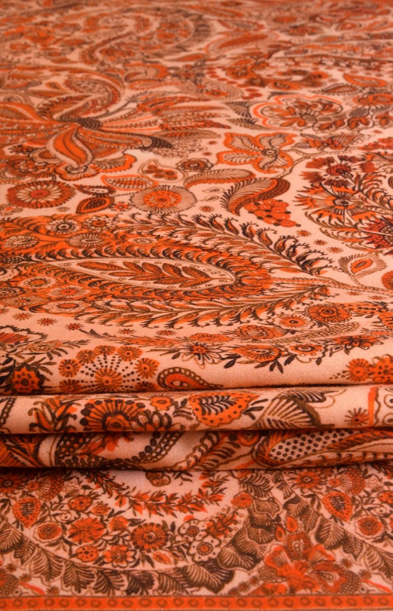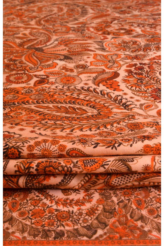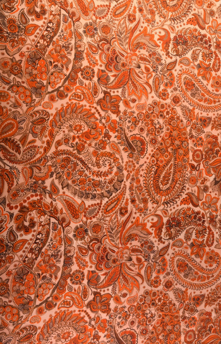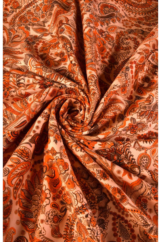 Cotone elastico nei caldi colori arancioni con un motivo paisley molto interessante, noto anche come turco o orientale.