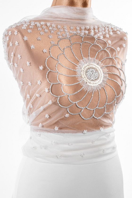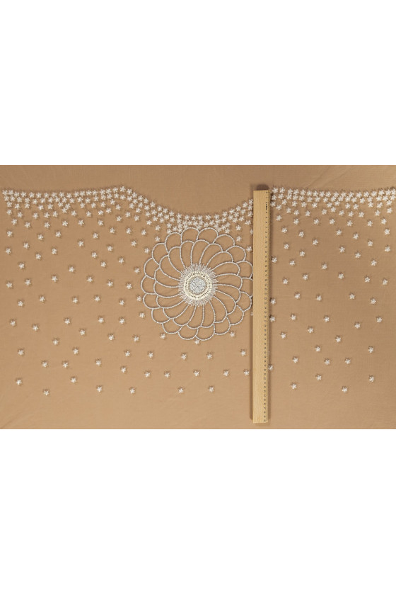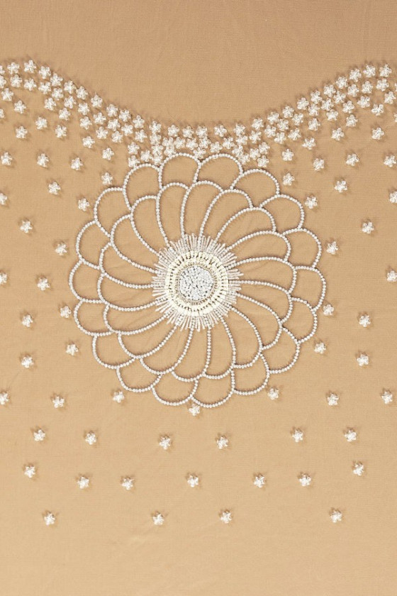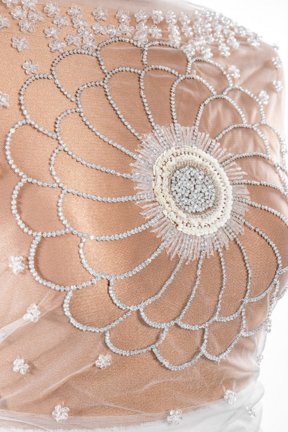 Appliqué da sposa italiano a forma di corsetto (camicetta - davanti). Su tulle color crema - al centro dell'applicazione è stato cucito un grande fiore (24 cm) fatto di perline trasparenti e paillettes - il centro del fiore è stato densamente riempito di perline e paillettes argento ed ecrù. La parte superiore del corsetto è densamente decorata con piccoli fiori trasparenti: il motivo diminuisce verso il basso.