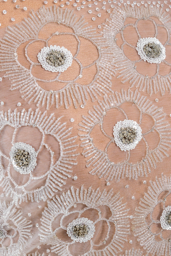 Appliqué da sposa italiano a forma di corsetto (blusa - davanti) color crema con accessori bianchi e argento. Un bellissimo motivo di grandi fiori (9 cm) fatto di perline trasparenti e paillettes bianco-argento. Il tutto è cucito su morbido tulle.
