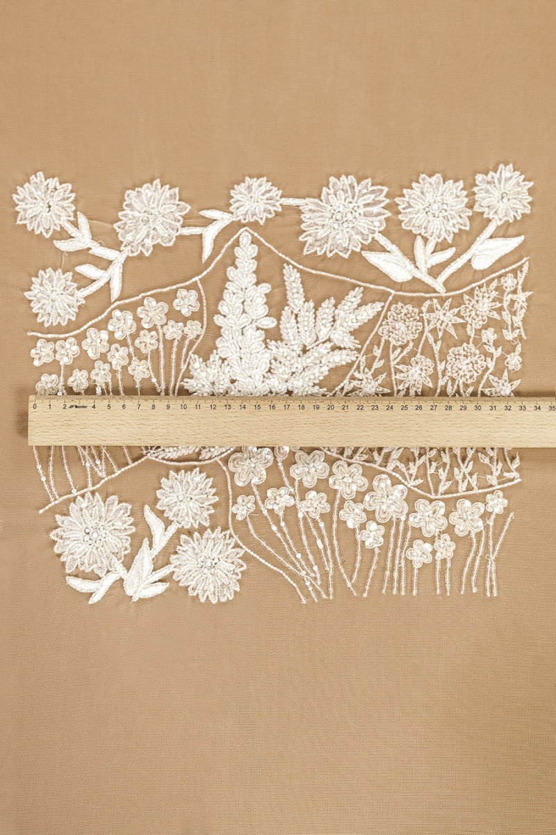 Italiano, grande appliqué da sposa ecrù. Un motivo di vari fiori fatto di paillettes trasparenti e perline e foglie ricamate.