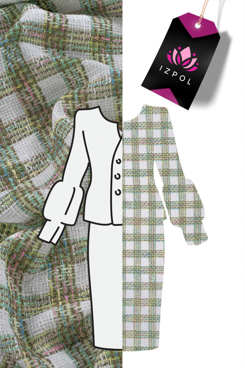 Tessuto per costumi chanel a scacchi in bianco e verde chiaro con accenti rosa e blu, destinato a gonne o abiti sottili. Il materiale è a trama larga al 100% in viscosa, motivo per cui è traspirante e traspirante.
