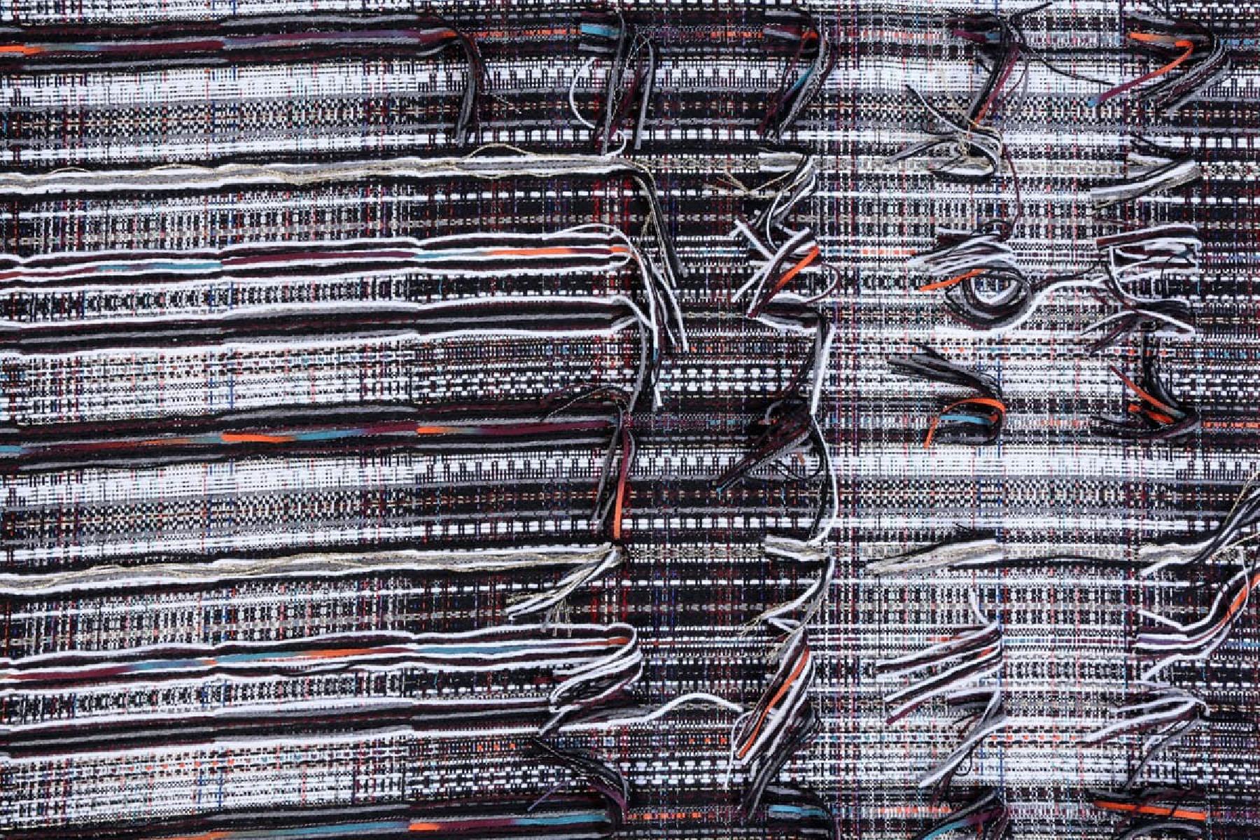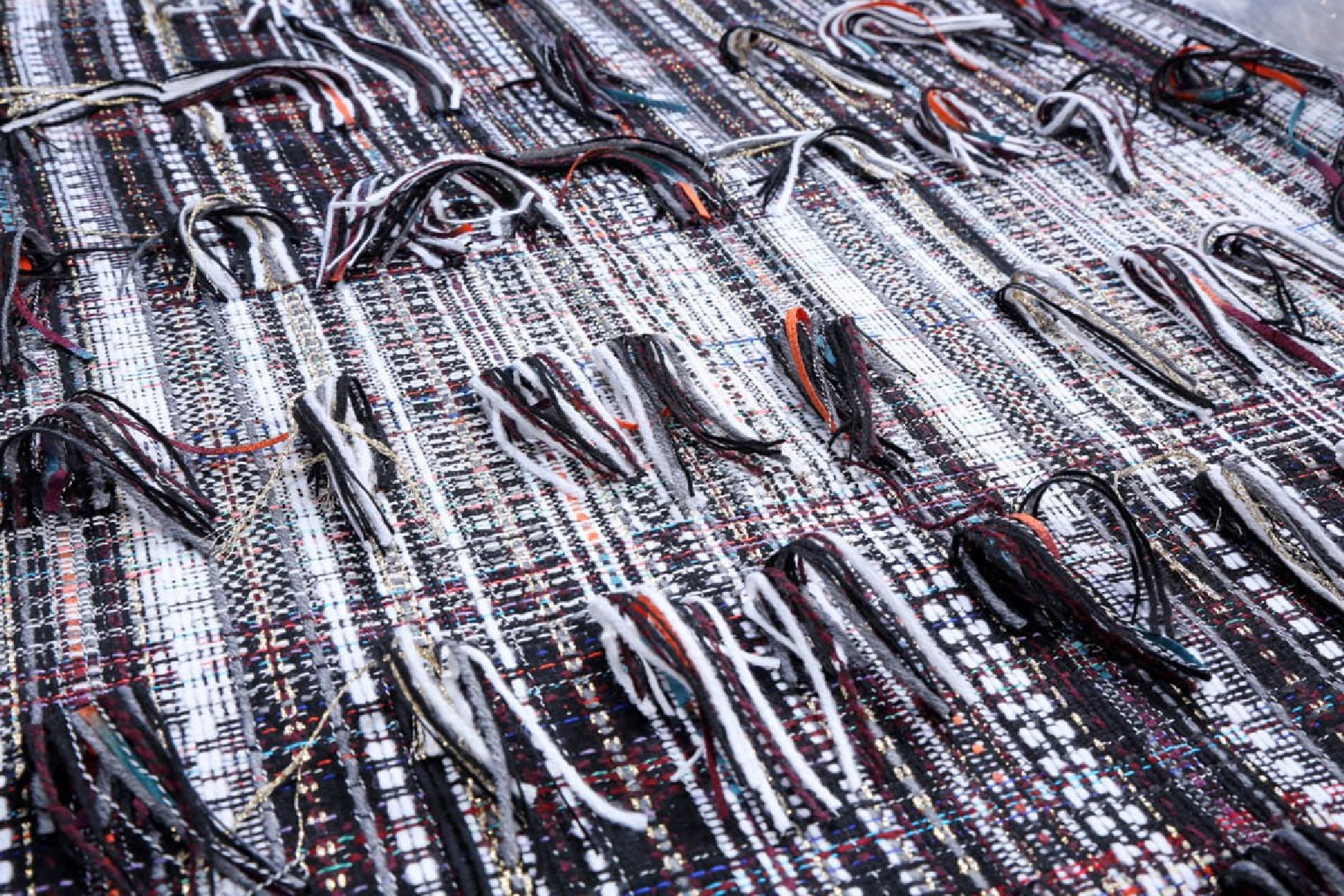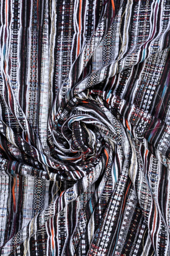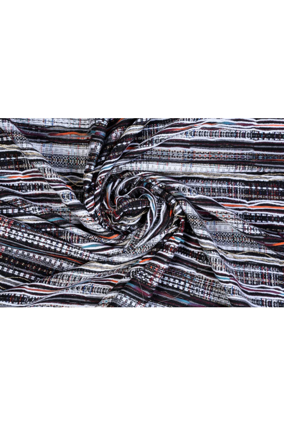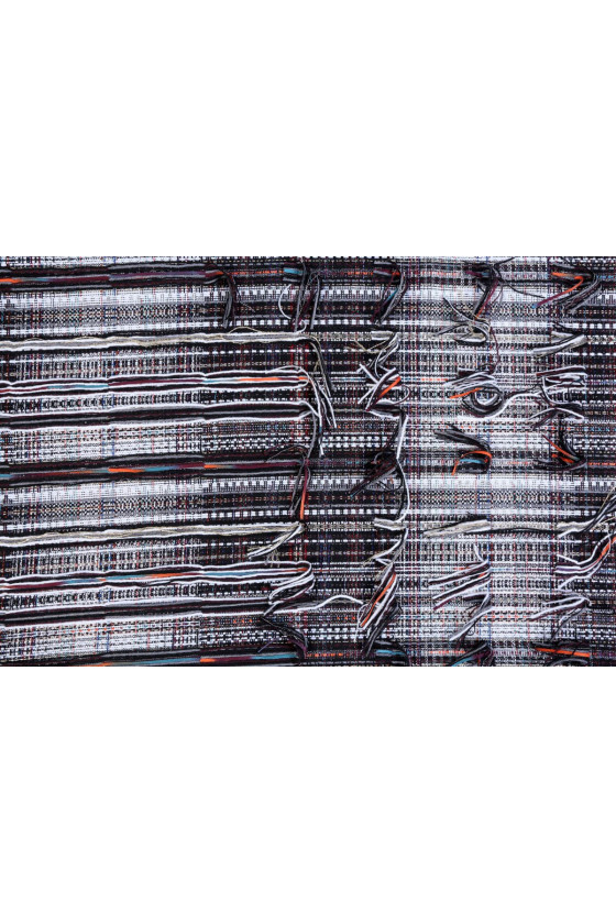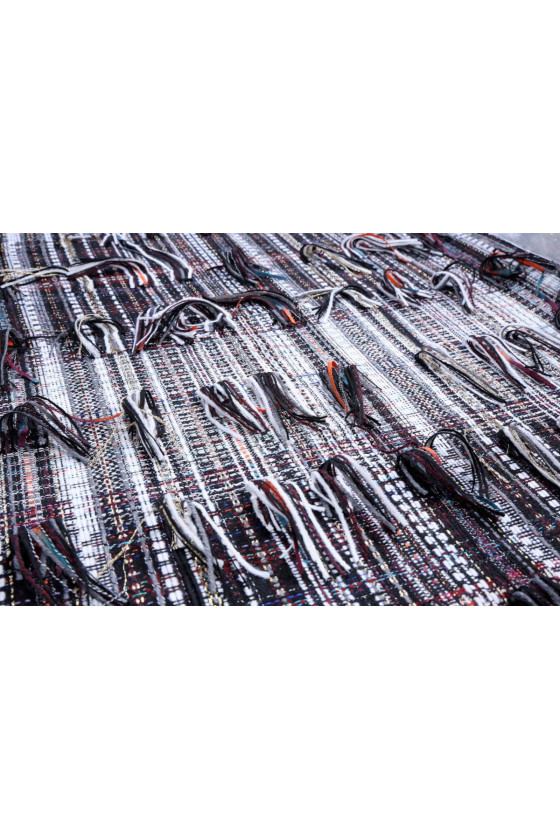 Bellissimo jacquard originariamente intrecciato da una miscela di fibre. I fili che vedete nelle foto allegate possono essere tagliati per creare un effetto frange. Questo bellissimo tessuto può essere utilizzato per cucire costumi, abiti, giacche e cappotti.