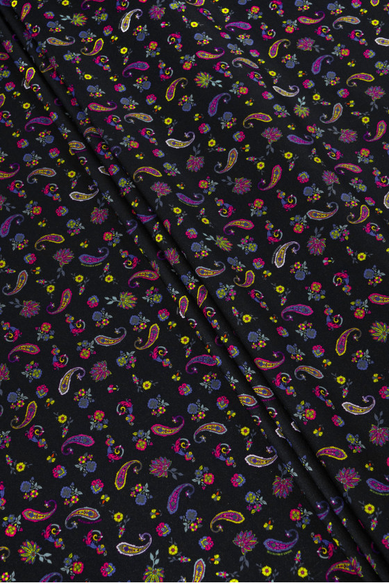 Tessuto di cotone italiano con trama in twill, che ricorda il denim. Un colorato motivo Paisley su fondo nero, tessuto firmato con il nome di una nota Casa di Moda. Il tessuto è più spesso, rigido, leggermente elastico. Perfetto per cucire un vestito, un pantalone, una giacca.