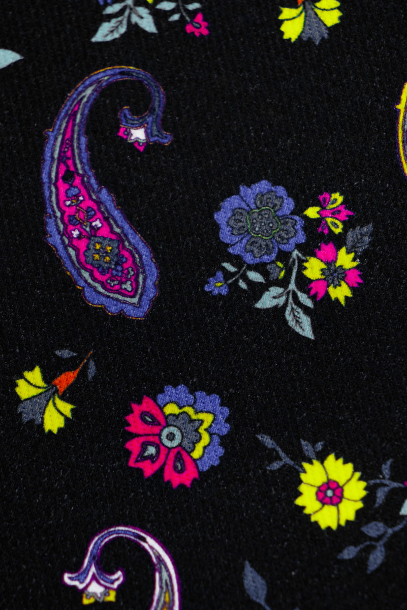Tessuto di cotone italiano con trama twill, che ricorda il denim. Un colorato motivo Paisley su fondo nero, tessuto firmato con il nome di una nota Casa di Moda.