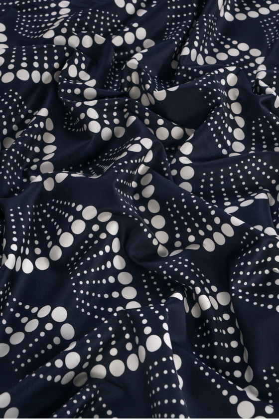 Elastico in cotone italiano di colore blu navy scuro con motivo a pois irregolari color panna. Il cotone è una fibra naturale al 100%. I tessuti di cotone sono resistenti, non si consumano rapidamente, mantengono le loro proprietà a lungo, sono perfettamente traspiranti, traspiranti, il che offre un elevato comfort di utilizzo. Tessuto leggermente elastico, opaco e opaco - perfetto per cucire un vestito, pantaloni, gonna o pantaloncini.