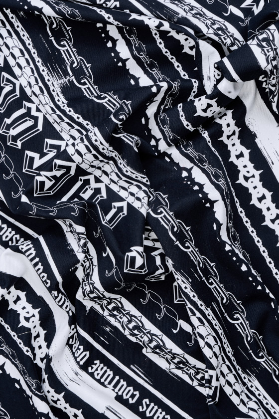 Tessuto di cotone italiano, twill con fantasie bianche e nere raffiguranti fili di catene, cigni e iscrizioni. Il tessuto è più spesso, elastico, si adatta bene e proviene dalla collezione di un noto stilista. Un'ottima proposta per gli appassionati di design di marca, è perfetto per katane, gilet, gonne e pantaloni.