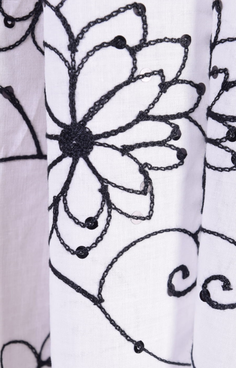 Cotone sottile e batista. Tessuto non elastico. Ci sono motivi ricamati con paillettes su cotone. Perfetto per abiti, gonne, camicie.