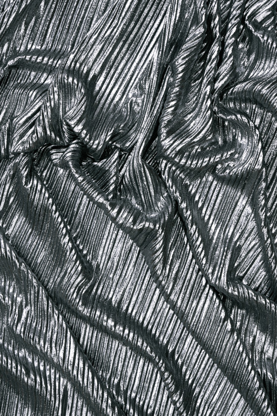 Tessuto efficace e lucido finemente plissettato nei colori nero e argento.
