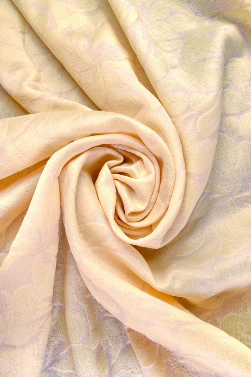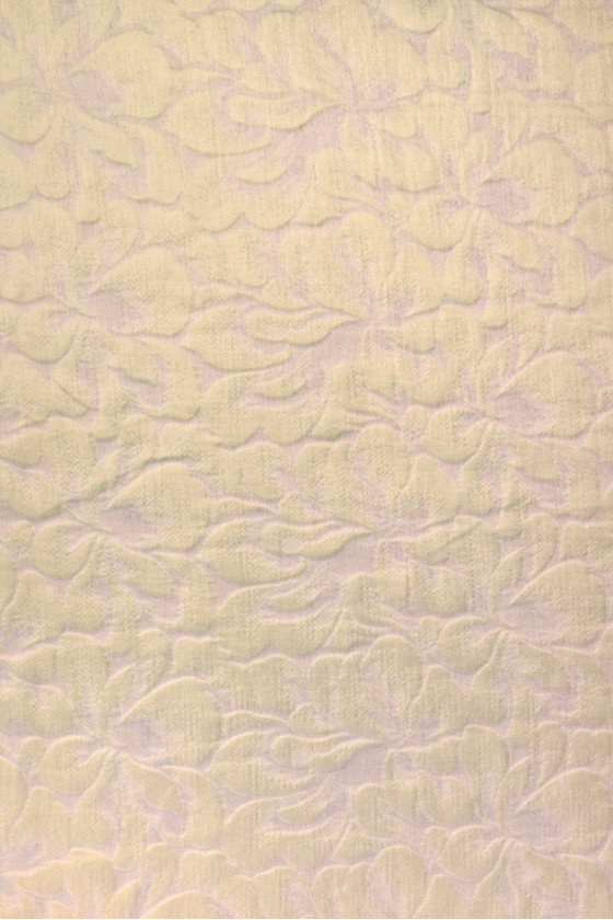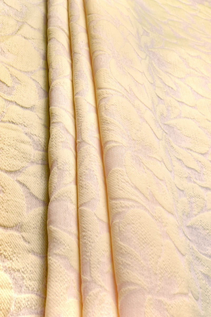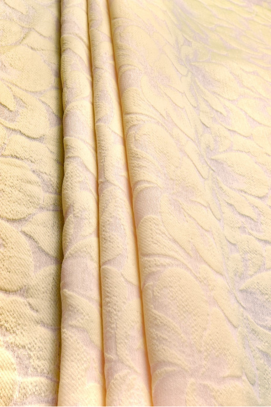 Jacquard vaniglia con motivo floreale in rilievo. La struttura del tessuto è ideale per cucire abiti e gonne eleganti. Può essere utilizzato anche come tessuto decorativo.