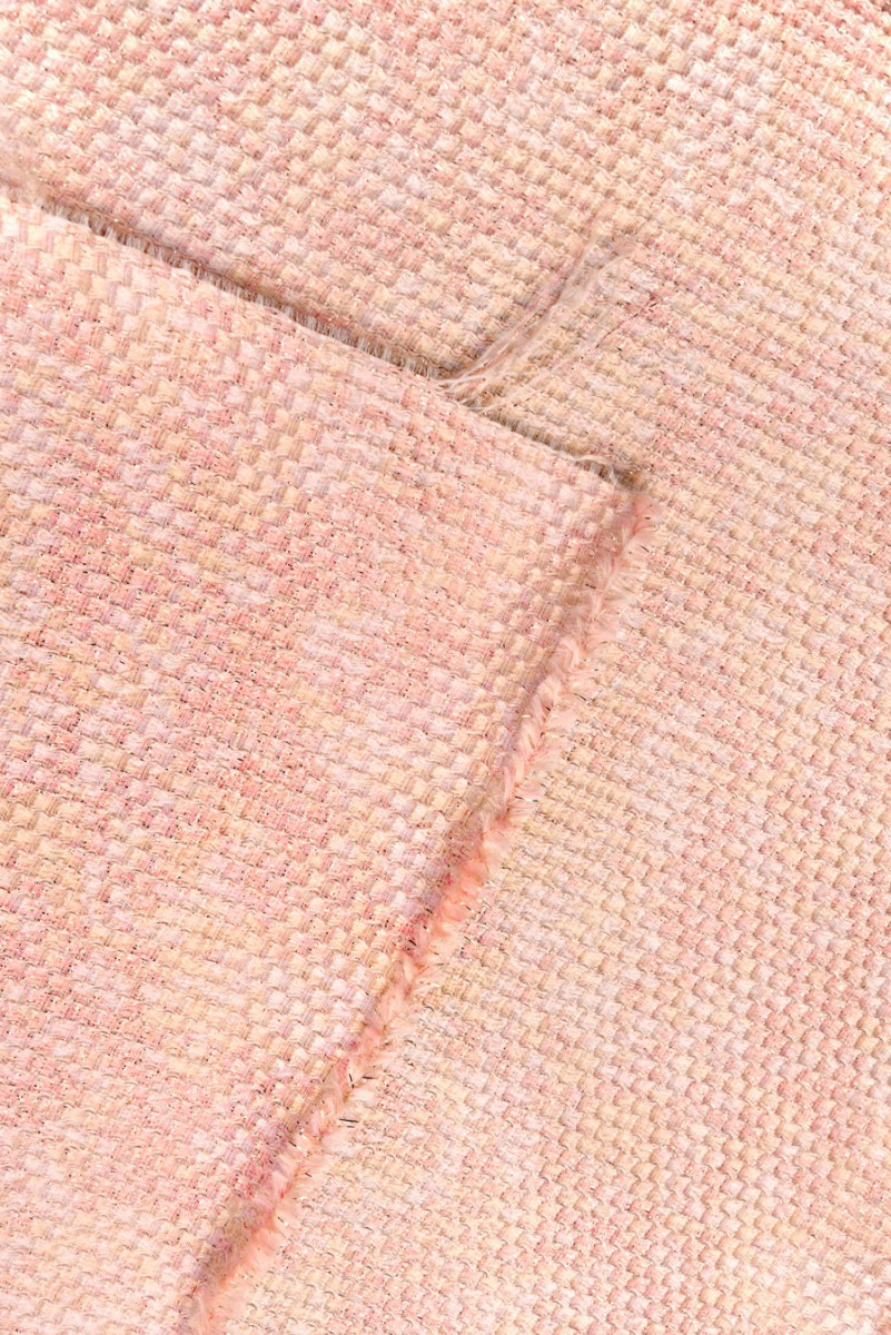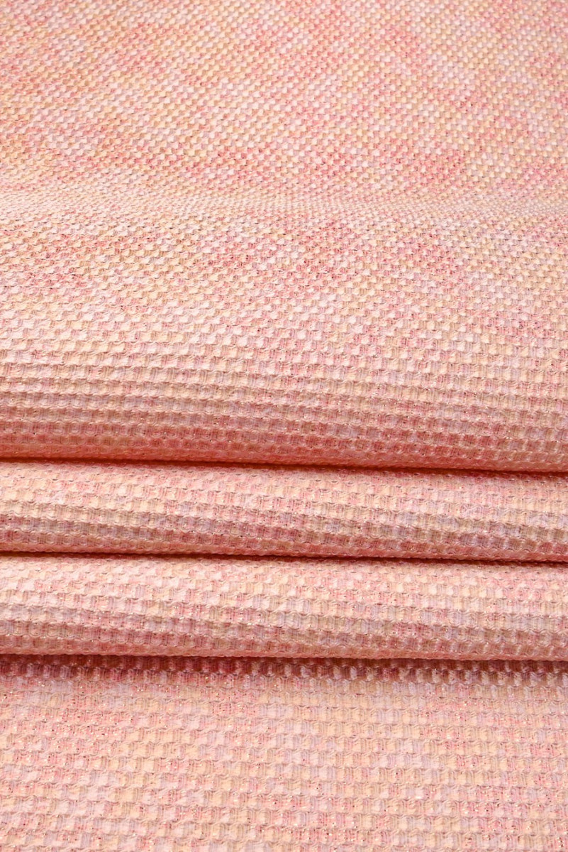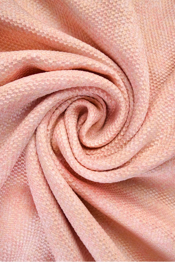 tessuto jacquard italiano costumi colore giallo salmone. Tessuto con un motivo geometrico fine e goffrato che ricorda i nidi d'ape. Il tutto è decorato con un filo d'oro lucido, che gli conferisce eleganza e raffinatezza. Una proposta molto sottile per cucire un cappotto, un costume o come tessuto decorativo.