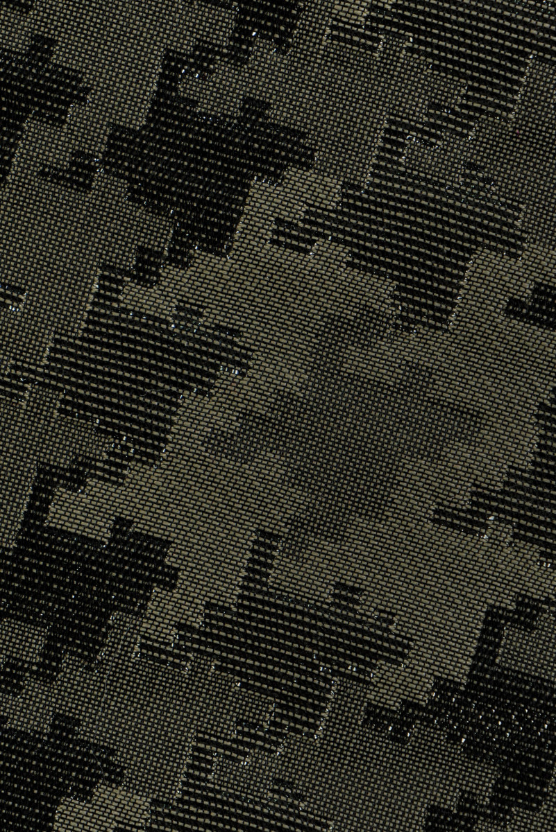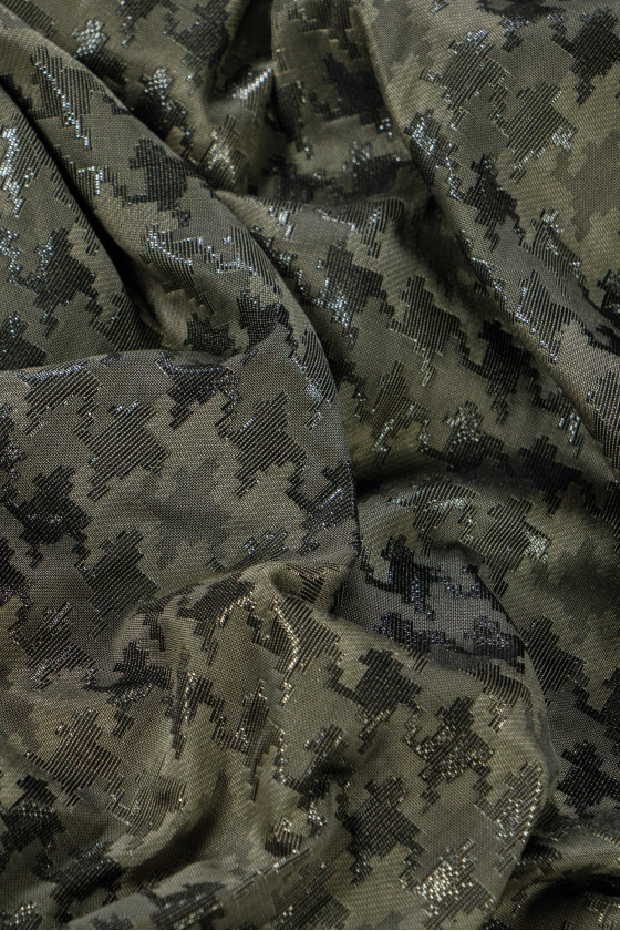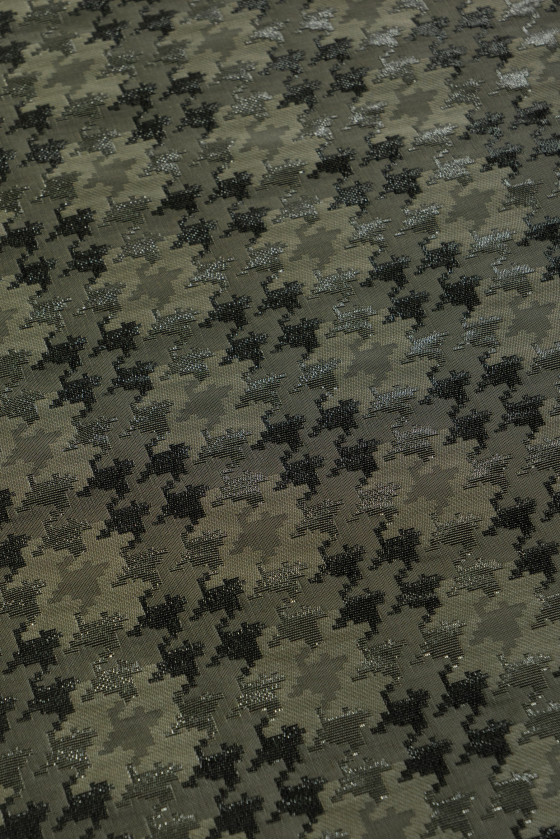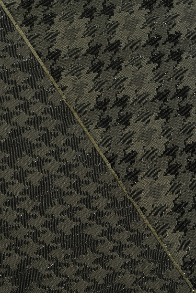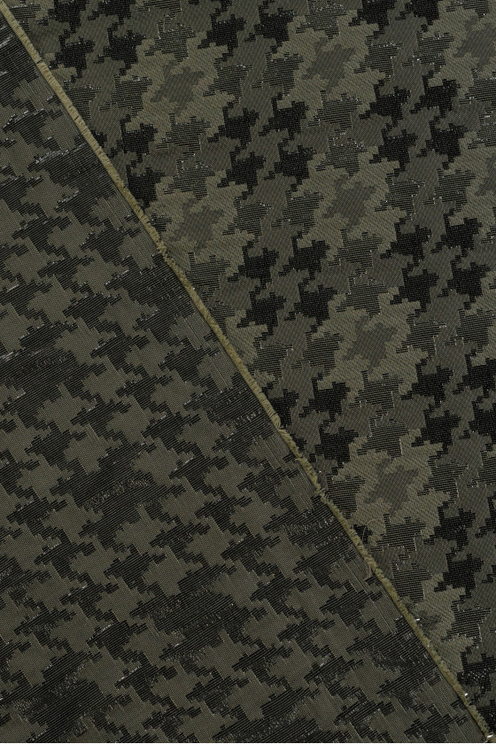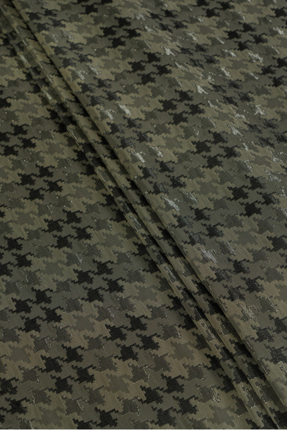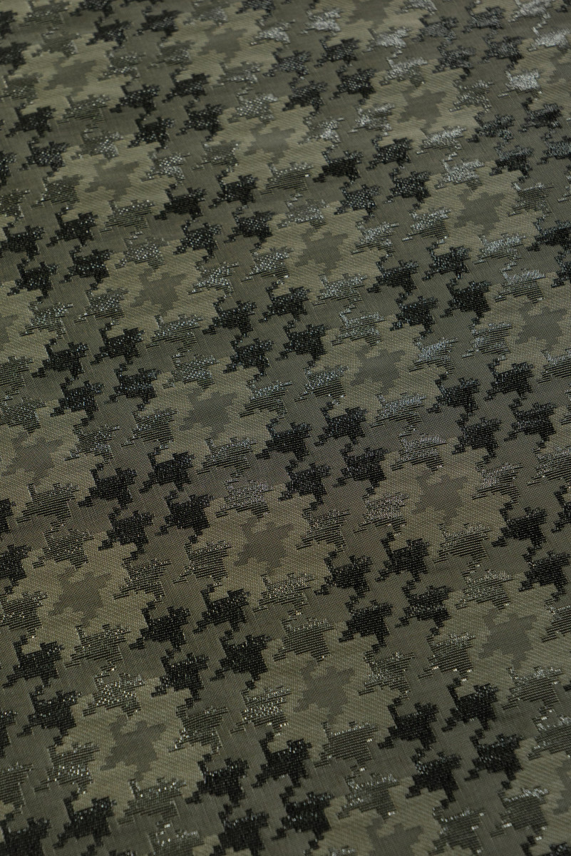 Tessuto jacquard italiano per costumi con motivo a zampa di pollo grigio-oliva, il tessuto è splendidamente decorato con filo di lurex.