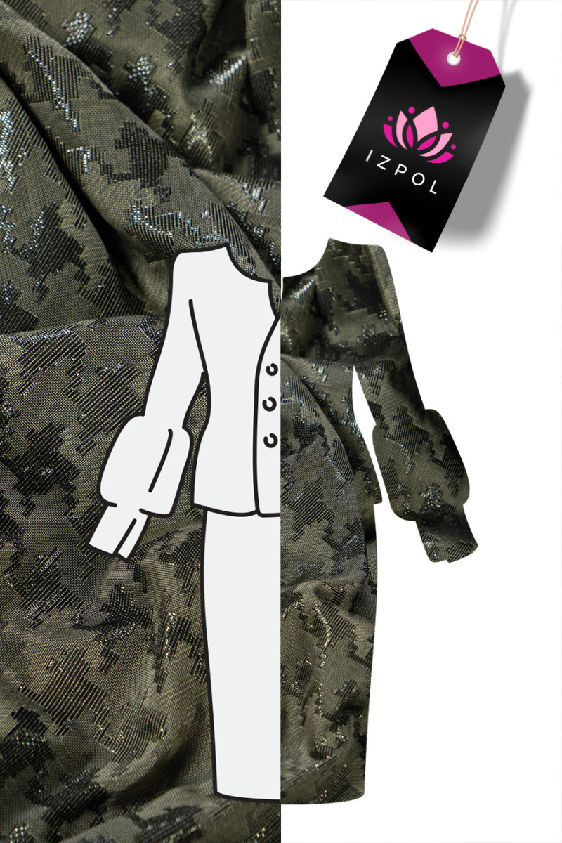 Tessuto jacquard italiano per costumi con motivo a zampe di pollo grigio-oliva, il tessuto è splendidamente decorato con filo di lurex. Il tessuto è più spesso, rigido, non elastico con una lucentezza caratteristica. Perfetto per cucire un vestito, un costume, una gonna o per scopi decorativi.