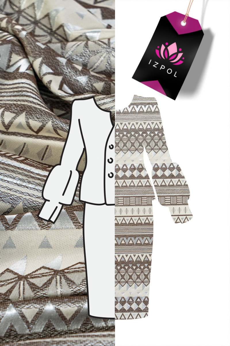 Tessuto jacquard italiano per costumi con piccoli motivi geometrici nei colori beige e marrone, decorato con filo di lurex argento. Tessuto più sottile e leggermente rigido - perfetto per cucire un vestito, un costume, una gonna, una giacca. Composizione: 87% cotone, 11% poliestere, 2% poliammide