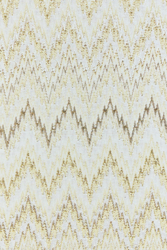 Tessuto jacquard italiano con motivo a zig-zag beige e oro. Motivo regolare e denso splendidamente decorato con filo d'oro. Il tessuto è di medio spessore, leggermente rigido, non elastico e opaco. Una proposta impressionante e fresca da cui puoi creare costumi, gonne, giacche o cappotti primaverili.