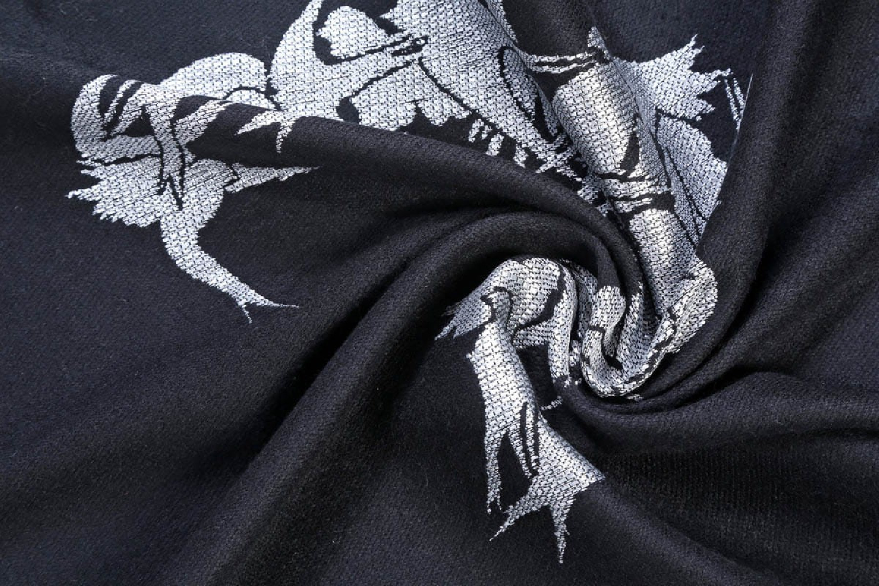 Tessuto jacquard italiano in un coupon con dimensioni di 65cm x 65cm. Un modello molto interessante di rondini d'argento che formano un punto interrogativo. Il tutto è ricamato su fondo nero e dona un effetto molto originale. Il tessuto può essere utilizzato come dettaglio originale in combinazione con un altro materiale, ad esempio come "davanti" di una felpa o come "dietro" di una giacca. Sarà perfetto anche come decorazione, ad esempio come cuscino.