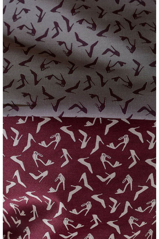 tessuto jacquard italiano costumi con motivo scarpa. Da un lato, il materiale ha una trama bordeaux liscia e leggermente lucida con un motivo grigio-beige e dall'altro lato ha uno sfondo grigio-beige opaco con un motivo bordeaux. Il motivo delle scarpe è molto denso e ha una dimensione di circa 1,5-2 cm. Una proposta fantastica per le persone che amano i modelli insoliti. È perfetto per cucire, ad esempio, un gilet per un abito, una giacca o capi di abbigliamento in combinazione con un altro tessuto.