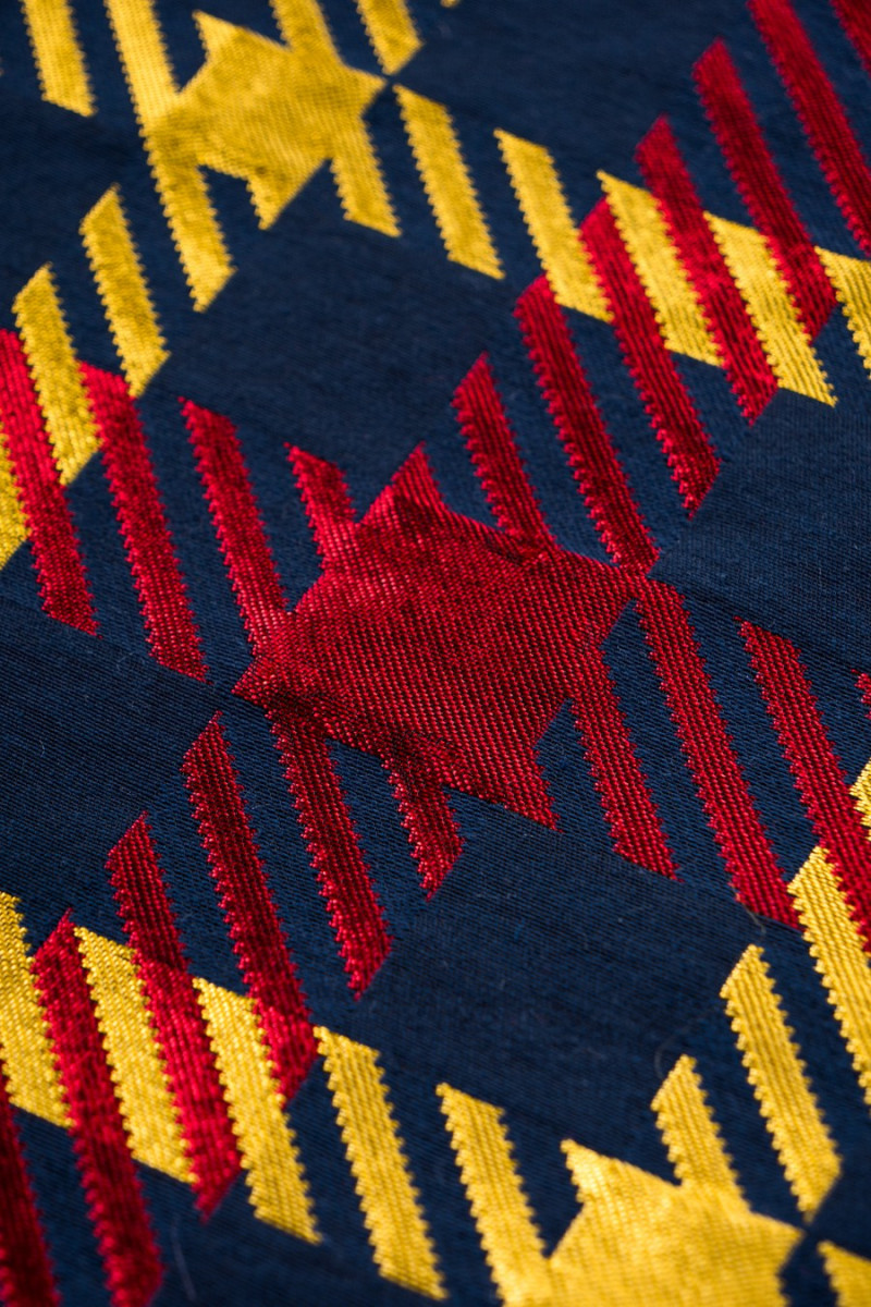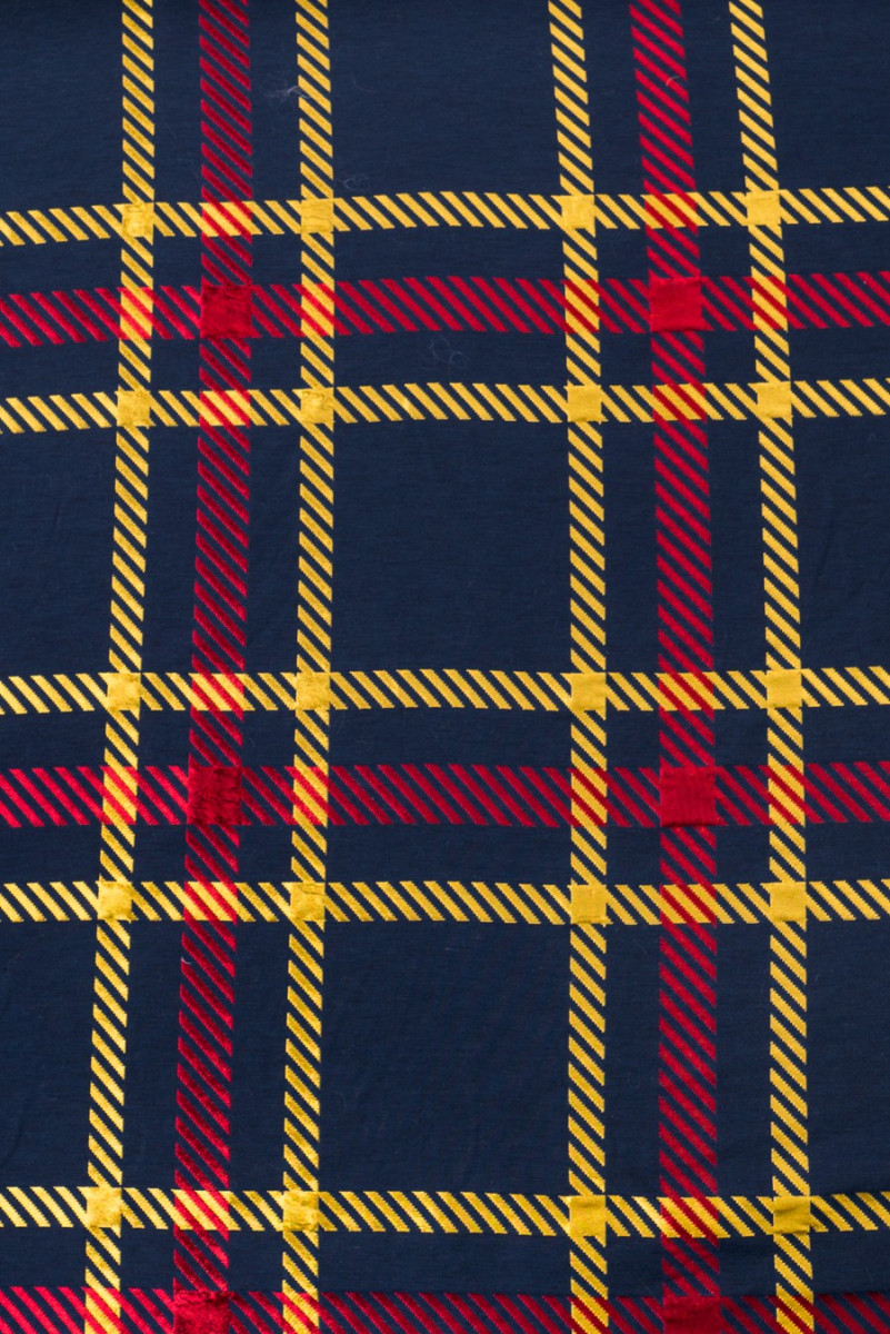 Tessuto jacquard italiano per costumi con un grande motivo a quadri di circa 20 cm. E' costituito da strisce larghe circa 3-4 cm, disposte in strisce diagonali più piccole. Il materiale è in un bellissimo colore blu navy con un motivo giallo e rosso. A causa del fatto che il motivo è molto grande, il tessuto è più adatto per cucire indumenti costituiti da elementi più grandi come un cappotto, una giacca o un vestito o una gonna "grande".