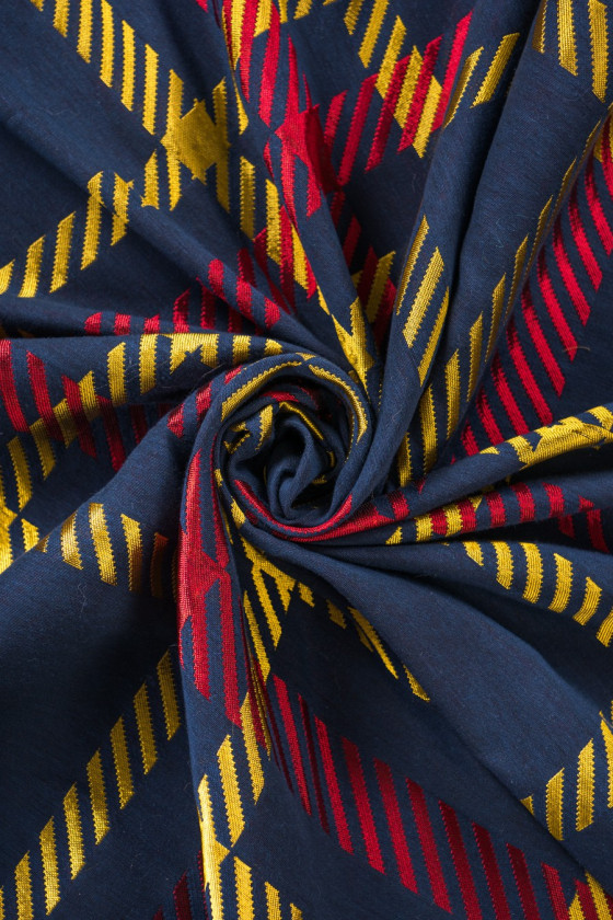Bellissimo jacquard blu navy con un grande check colorato. Tessuto non elastico. Perfetto per cappotti sottili, abiti, giacche.