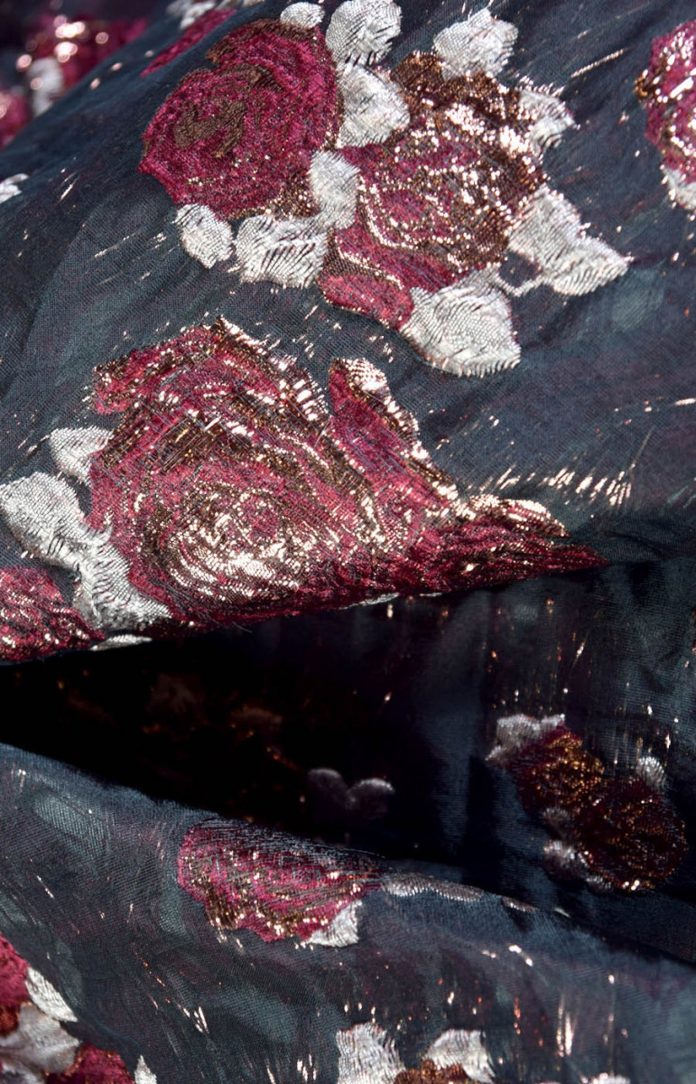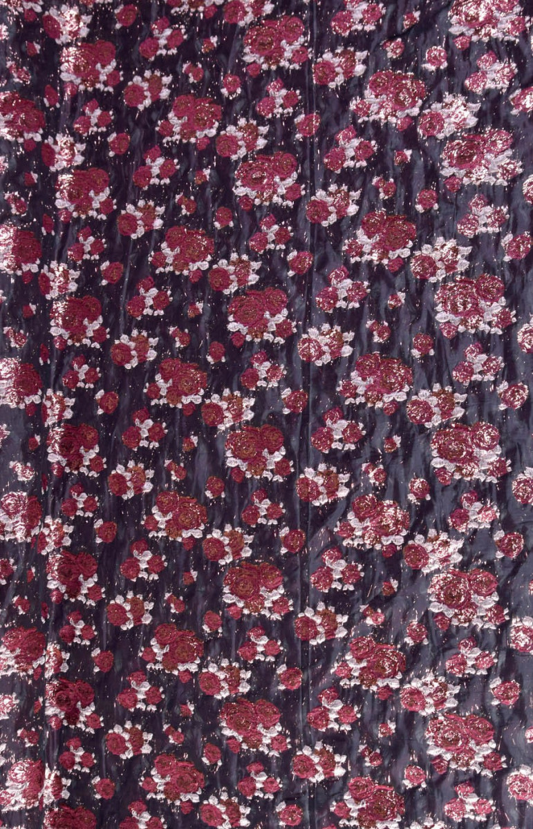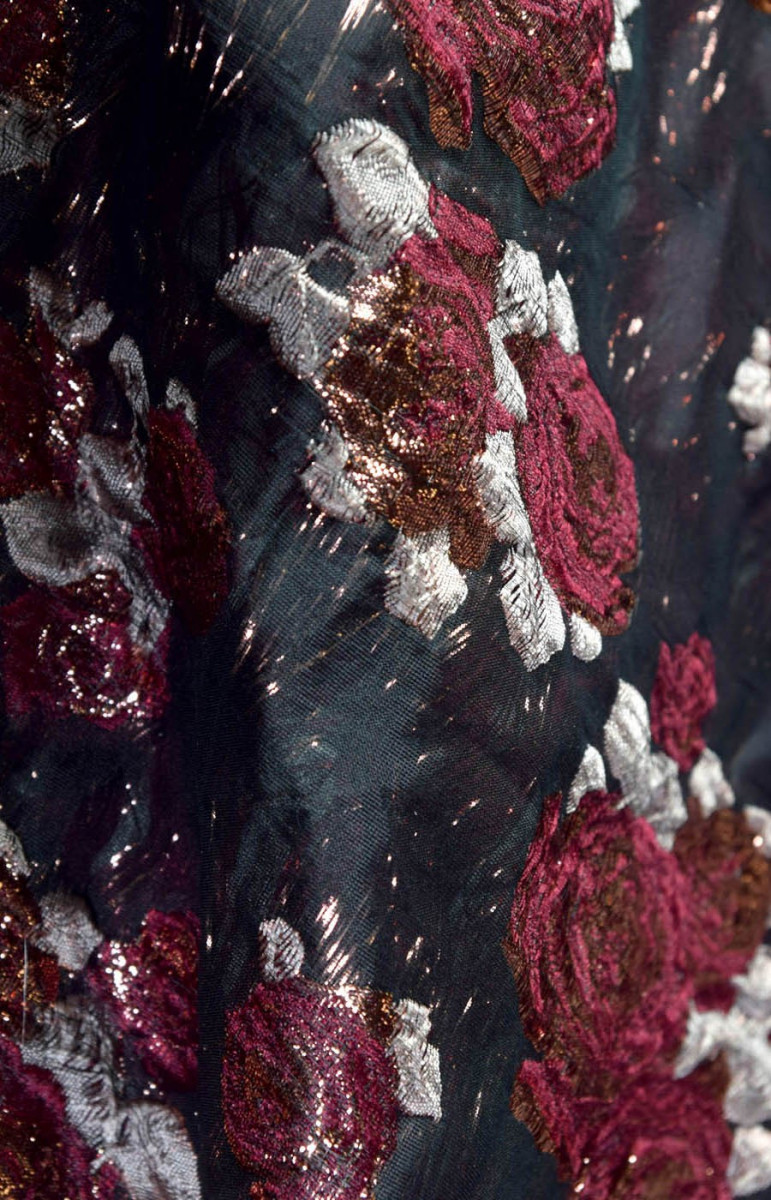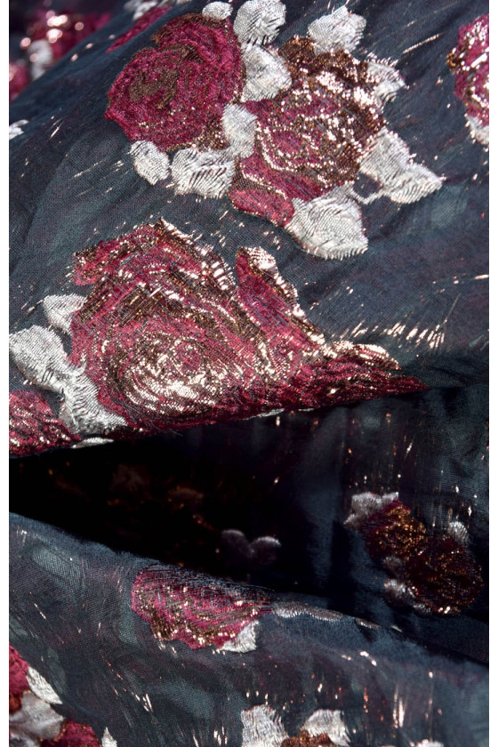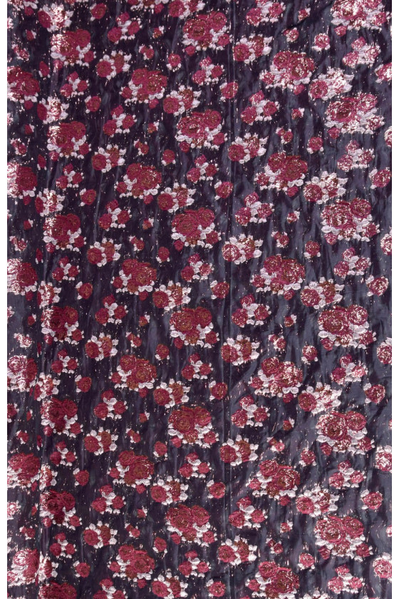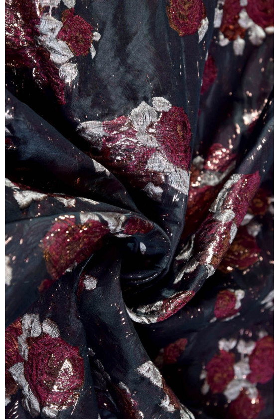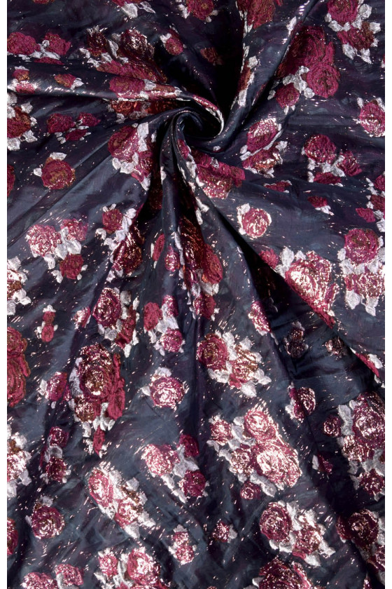 Ricchissimo tessuto jacquard costume in nero con motivo floreale in bordeaux e rosa con filo di lurex ramato. Tessuto morbido e non elastico.
