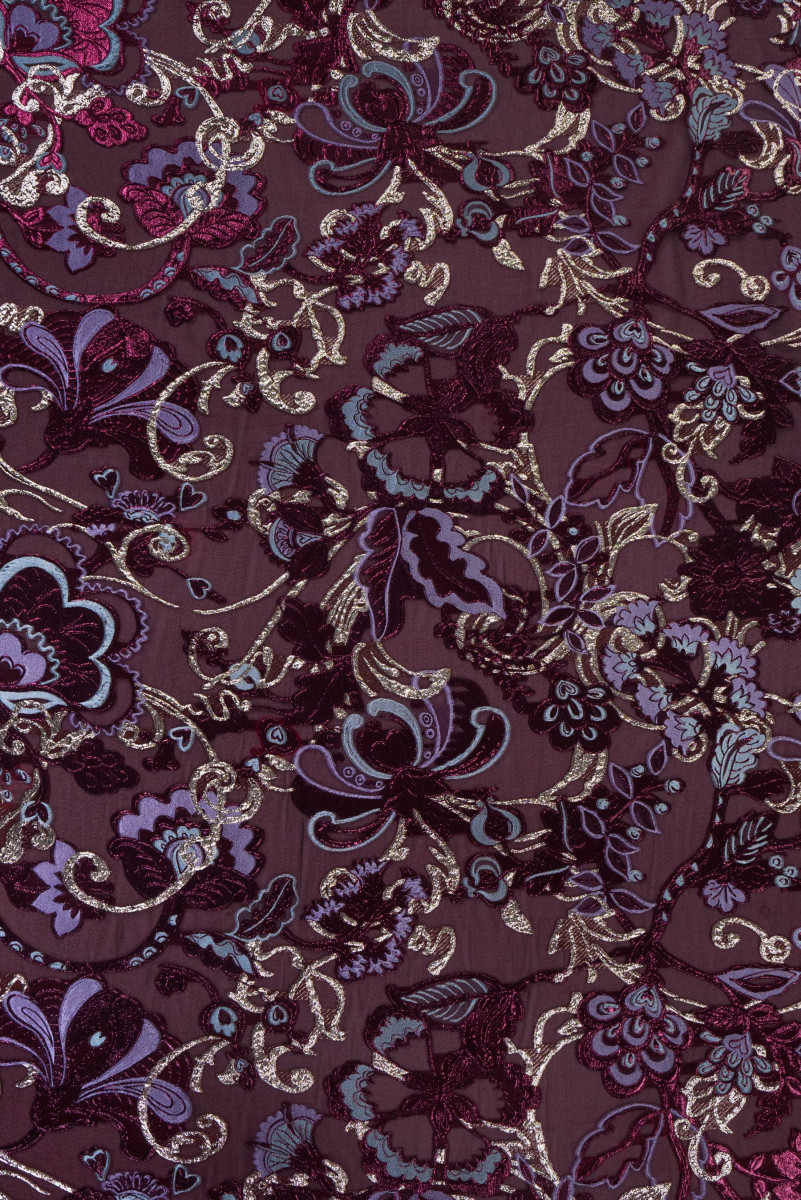 Tessuto italiano elegante in organza con motivi jacquard. Un prodotto molto esclusivo realizzato in seta naturale in bordeaux con poliestere, ricamo orientale in bordeaux e melange, decorato con un filo lucido. L'organza è sottile e trasparente, ma allo stesso tempo rigida, il che conferisce leggerezza al tessuto e il ricco motivo lo rende una proposta fantastica per cucire un abito, una camicetta o una gonna fenomenali.