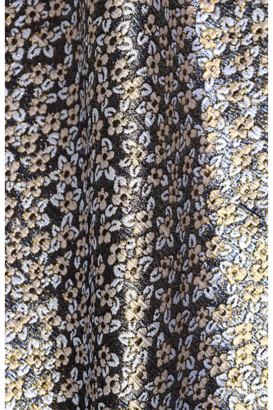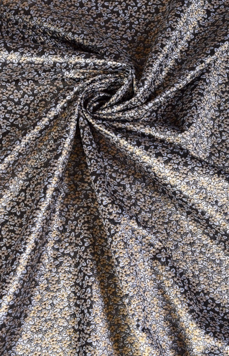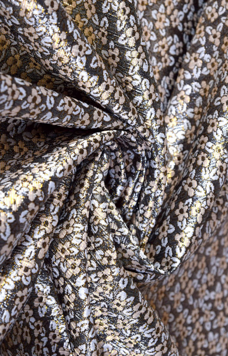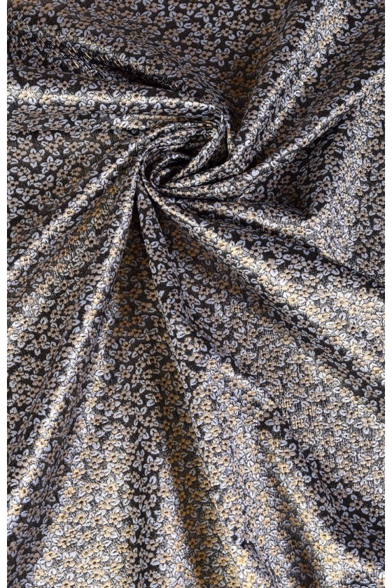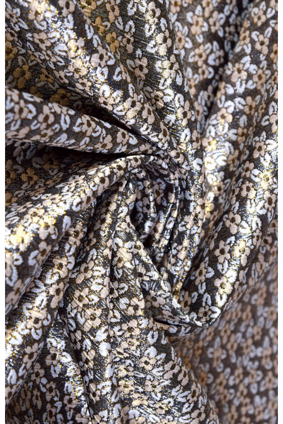 Bellissimo jacquard con un motivo molto denso di piccoli fiori. Il tessuto è non elastico, leggermente rigido, lucido. Perfetto per giacche, abiti, gonne e cappotti sottili.