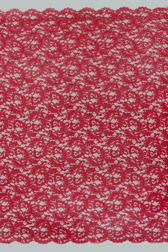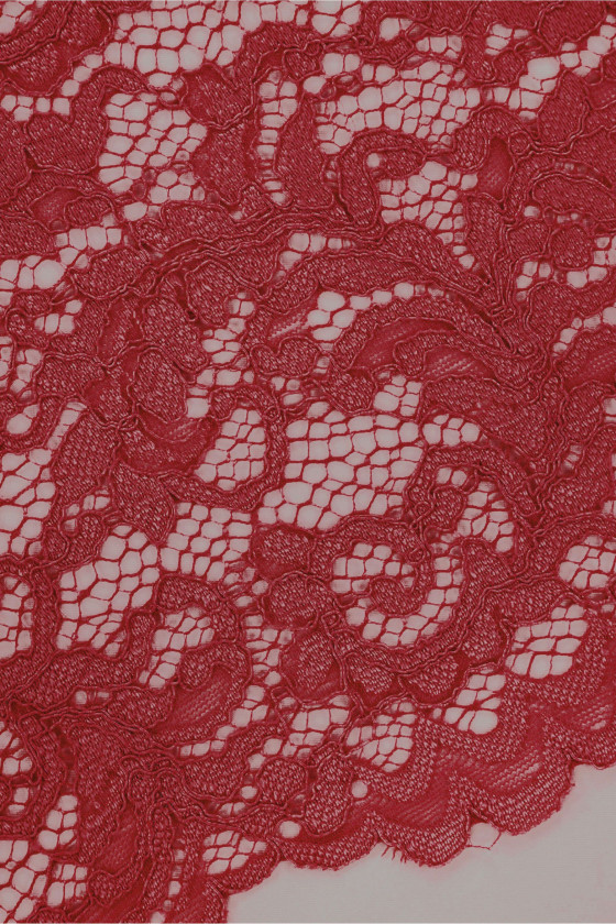 Pizzo italiano di colore rosso scuro. Il tessuto ha un fitto motivo floreale collegato con una rete e rifinito con un cordoncino. La corona è rifinita su entrambi i lati con un dente decorativo: la cuciamo circonferenzialmente. Una proposta molto carina per le persone che amano i colori classici.