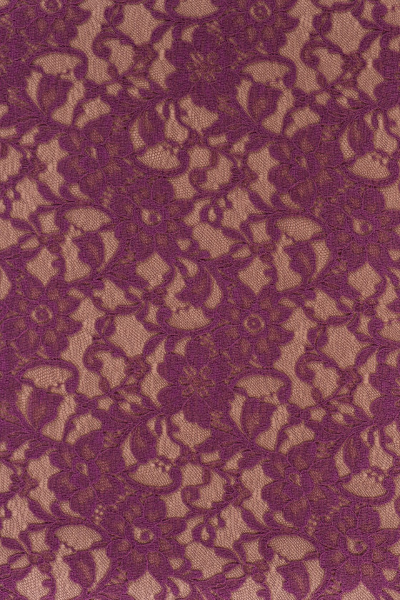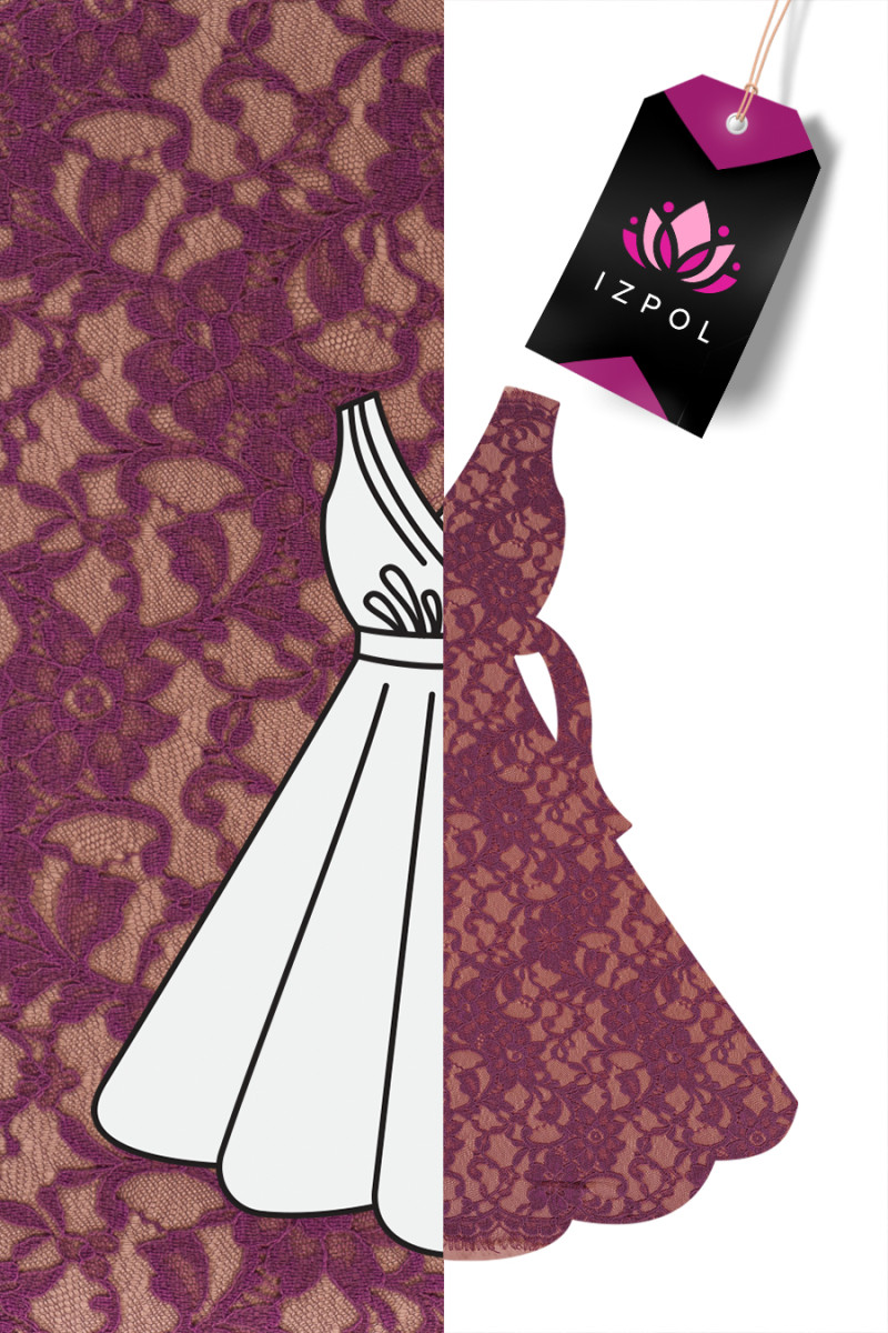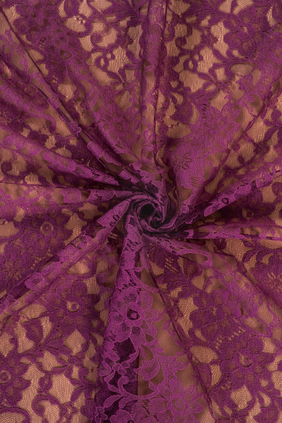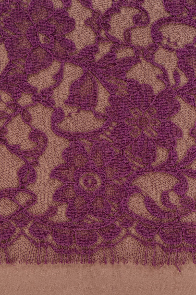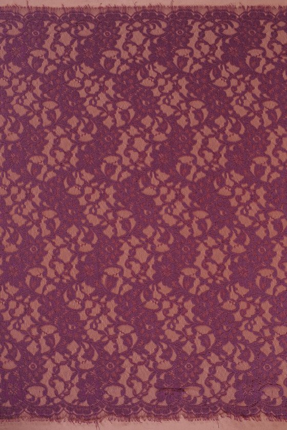 Pizzo sottile e delicato in viola tenue. Rifinito con un dente su entrambi i lati. Tessuto delicato. Perfetto per camicette, abiti.