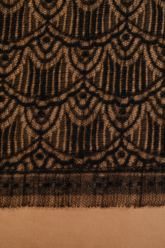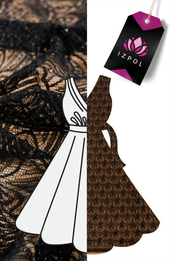 Il pizzo è largo 150 cm. Una combinazione di viscosa nera e fili di lurex. Questo dà l'effetto di un tessuto lucido. Uso consigliato: abiti lunghi o camicette.