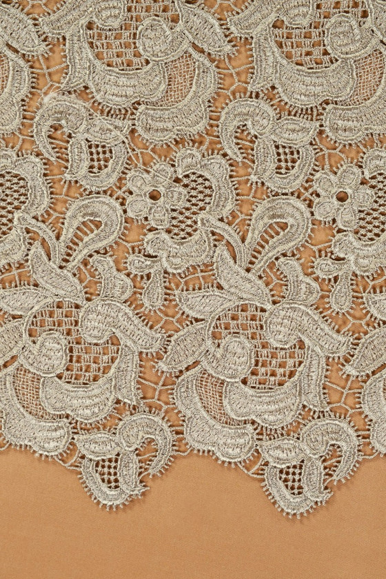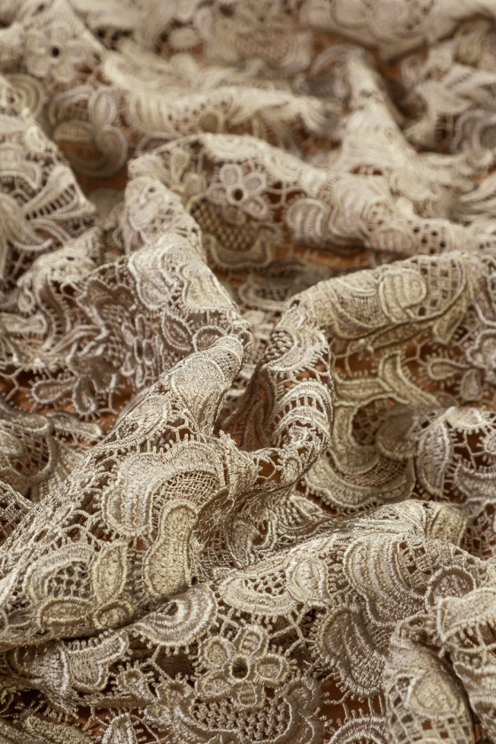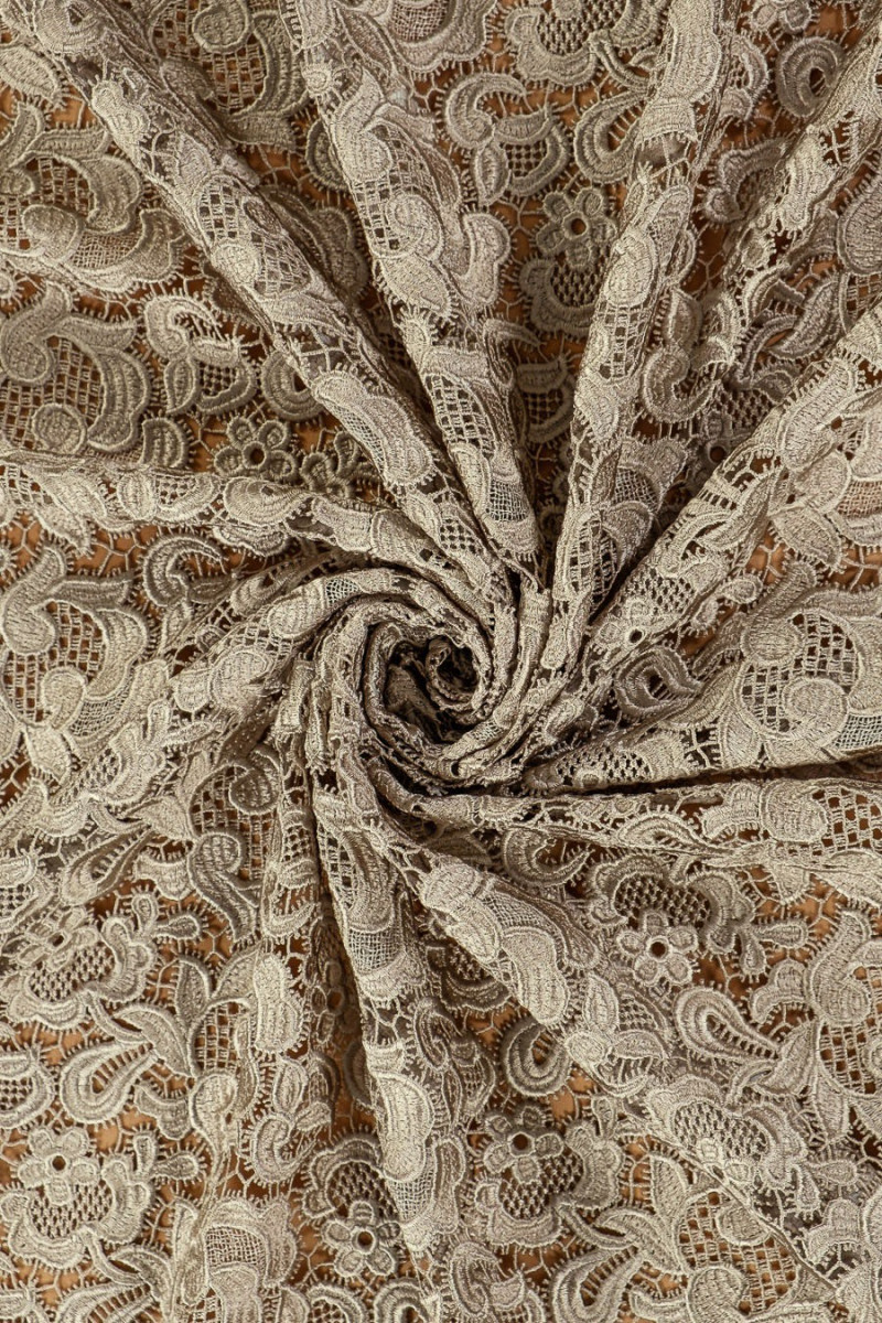Pizzo Gupure con una classica fantasia floreale in colore beige freddo. Per un bell'effetto, si consiglia di scegliere una fodera, ad esempio in raso di seta.