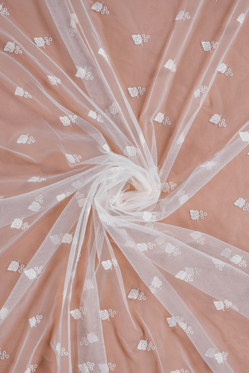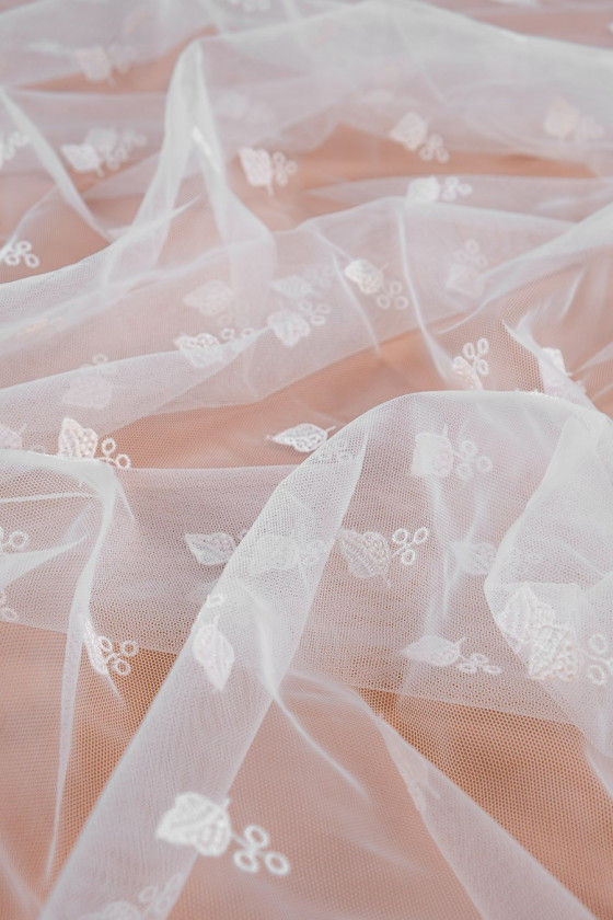 Bellissimo pizzo per abiti da sposa o camicette. Il tessuto è rifinito su un lato con un dente largo e sull'altro lato rifinito con una finitura di 1 cm.