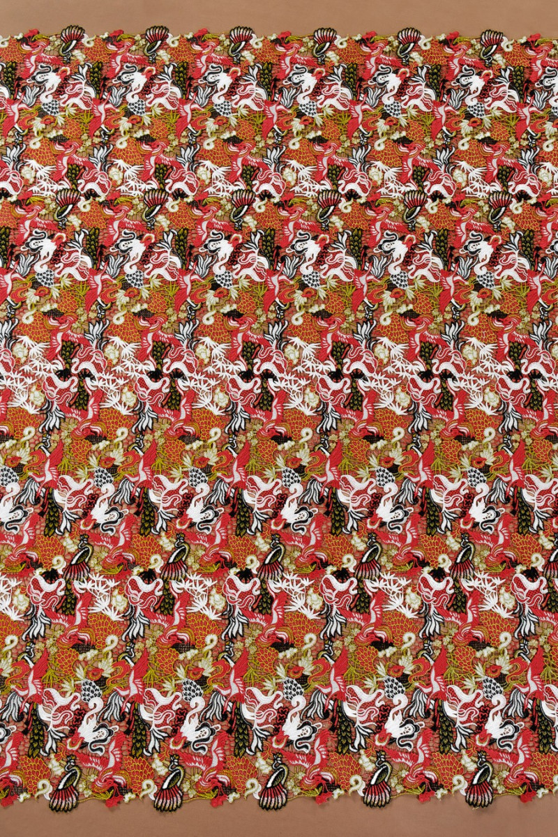 Bellissimo pizzo guipure con un originale motivo orientale. Il tessuto è più spesso, non elastico. Rifinito con un dente su entrambi i lati. Il tessuto è perfetto per gonne e abiti. Consigliamo!