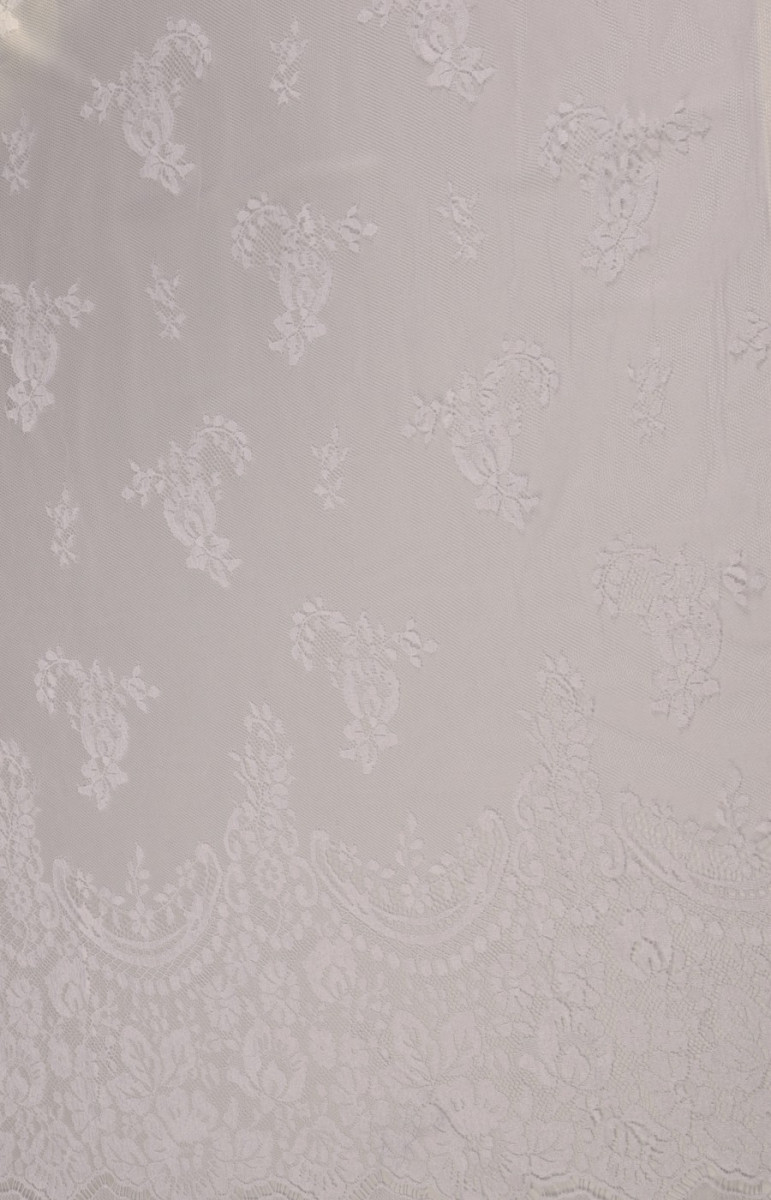 L'ultimo coupon con dimensioni di 150 cm * 100 cm pizzo nuziale in colore bianco crema, rifinito con un dente su entrambi i lati (in basso la larghezza del dente è di circa 25 cm). Il pizzo è delicato, morbido al tatto.