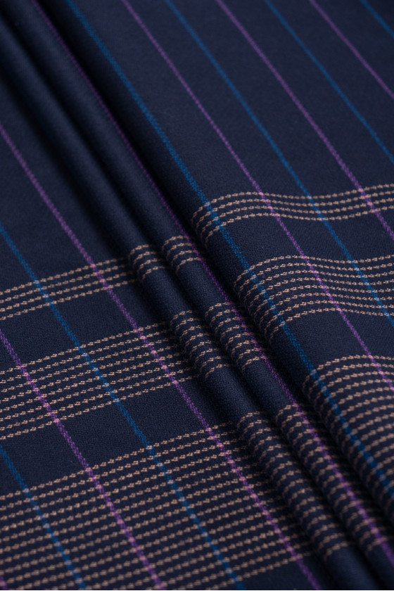 Una proposta molto originale per un cappotto o una giacca più sottile ad un ottimo prezzo! Tessuto di lana, strettamente intrecciato in una delicata trama jacquard, double-face. Su fondo blu navy, strisce verticali di blu e melange, ogni 5 cm una sottile striscia di filo di lurex (su un lato del tessuto), su una sottile striscia di beige in un rapporto fronte-retro a -45 cm dalla cimosa. La tessitura deve essere cucita circonferenzialmente, senza bisogno di fodera.