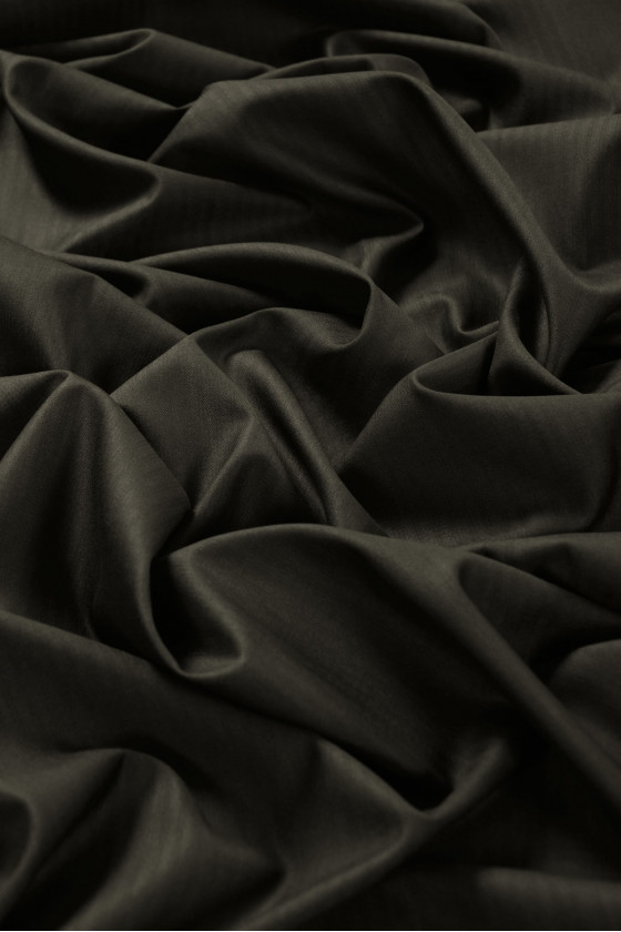 Tessuto italiano per costumi a righe in nero e oliva (bicolore) - una miscela di lana naturale e seta naturale. Un tessuto morbido, carnoso e non elastico con una lucentezza caratteristica dei tessuti di seta, perfetto per cucire un costume, un abito, un pantalone, una gonna o un vestito.