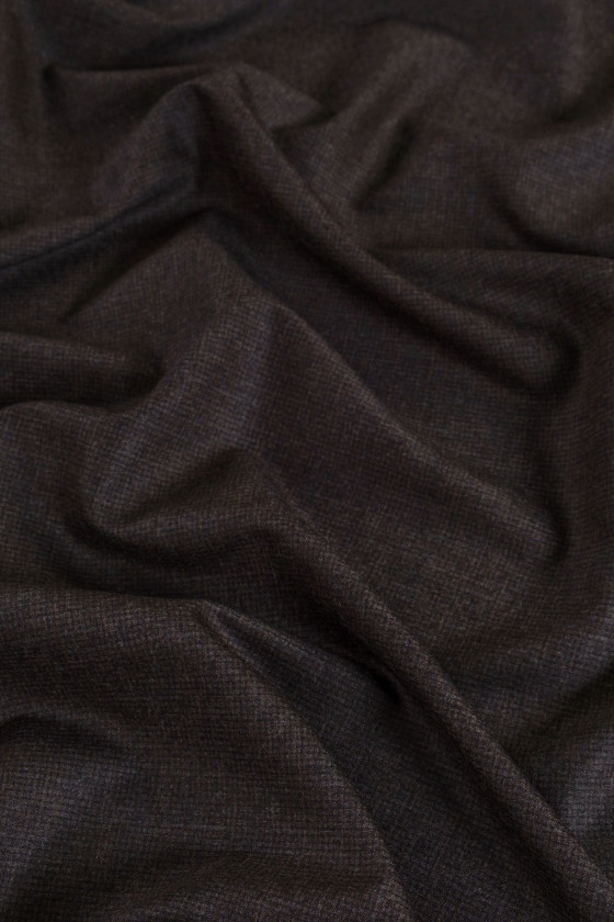 Costume italiano in lana nera e marrone con un fine motivo a quadri. Tessuto sottile, morbido, non elastico e dallo spessore classico.