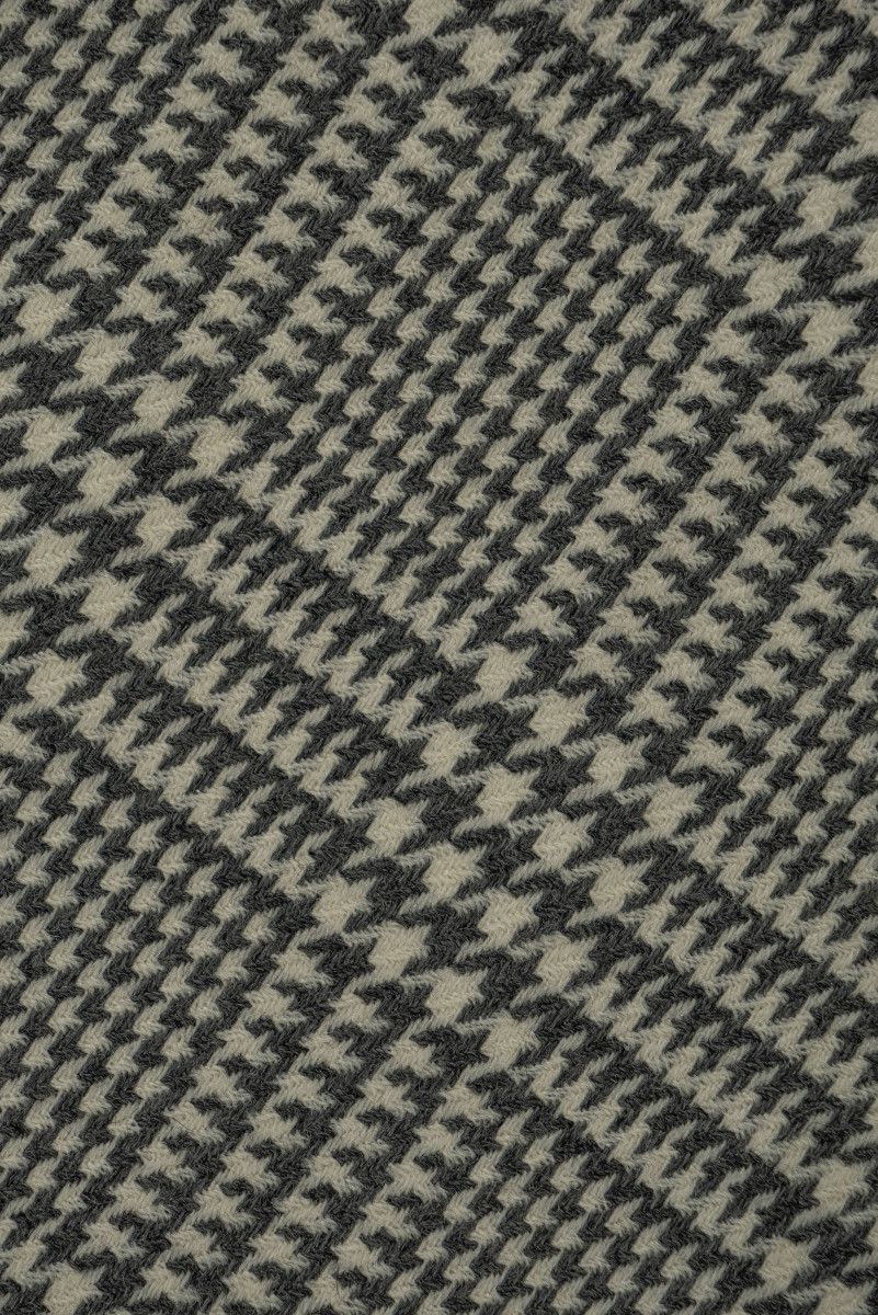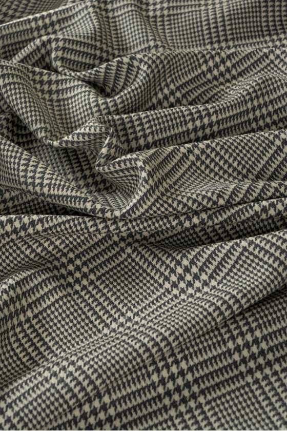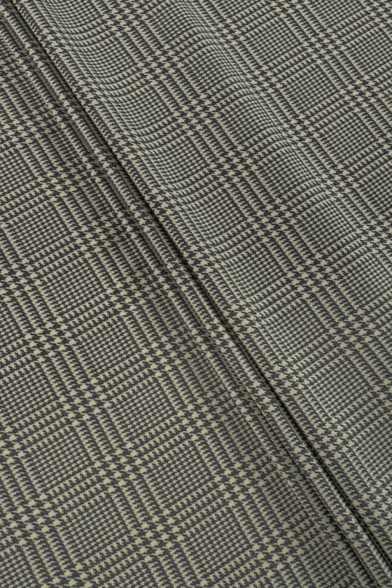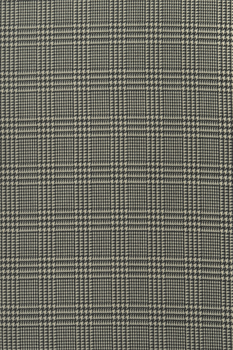 Costume italiano in lana con intreccio twill con motivo check e zampa di gallina in ecrù con grigio. Tessuto più spesso e carnoso del tipo autunno-inverno.