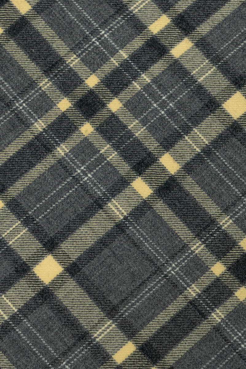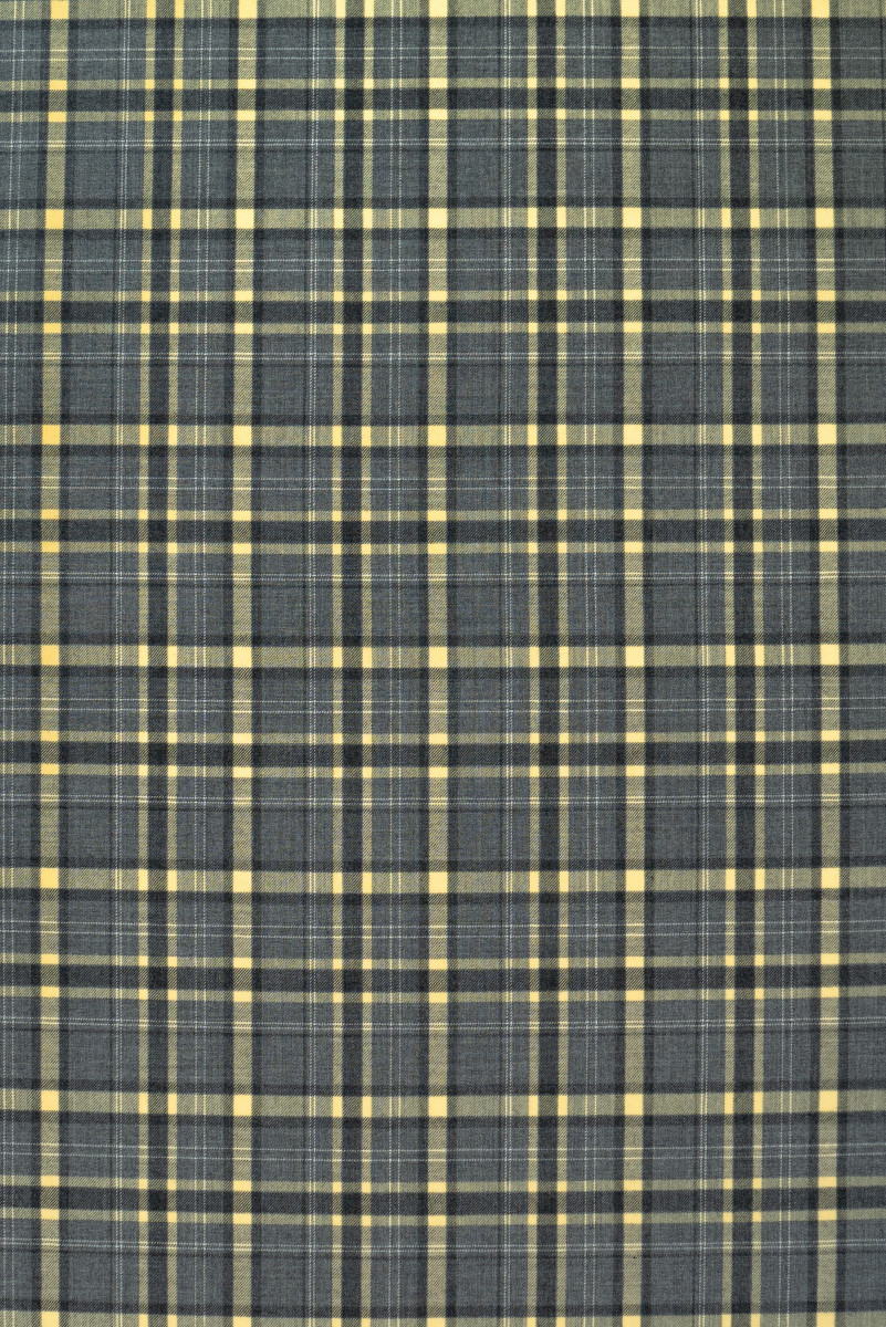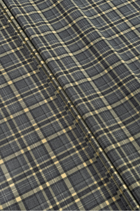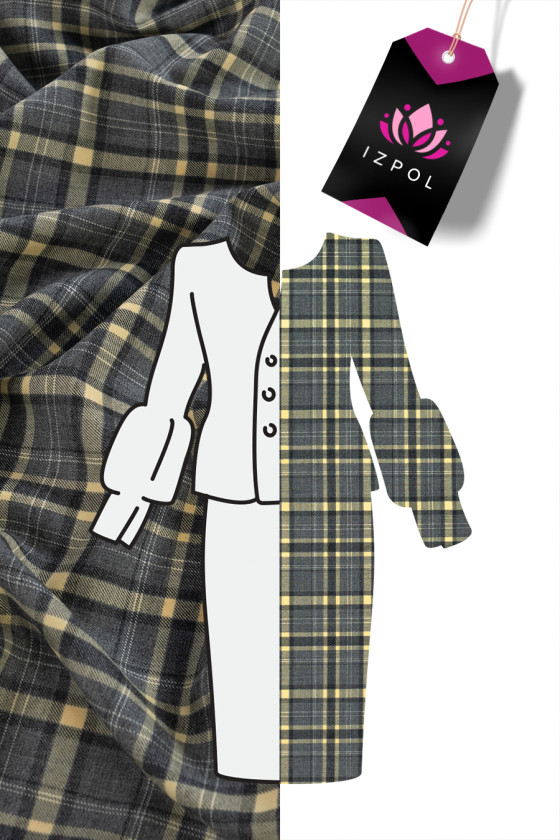 Costume italiano in lana con un misto di poliestere con motivo a quadri nei toni del grigio e del giallo. Un tessuto non elastico di medio spessore del tipo autunno-inverno. Perfetto per cucire un costume, un vestito, una gonna, un pantalone o un abito.