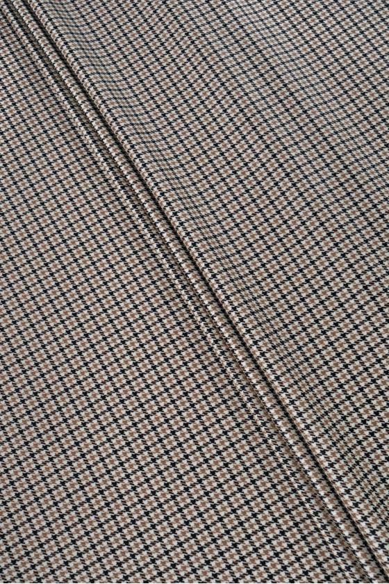 Costume italiano in lana beige chiaro con motivo a quadretti e pied de poule (2 cm) nei colori testa di moro e cammello. Tessuto più spesso, anelastico, carnoso del tipo autunno-inverno. Perfetto per cucire un costume, un vestito, una gonna o una giacca.