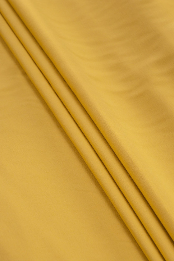 Tessuto a maglia jersey compatto ed elastico di colore giallo sole. Composto da: 82% viscosa, 12% poliestere, 6% elastan