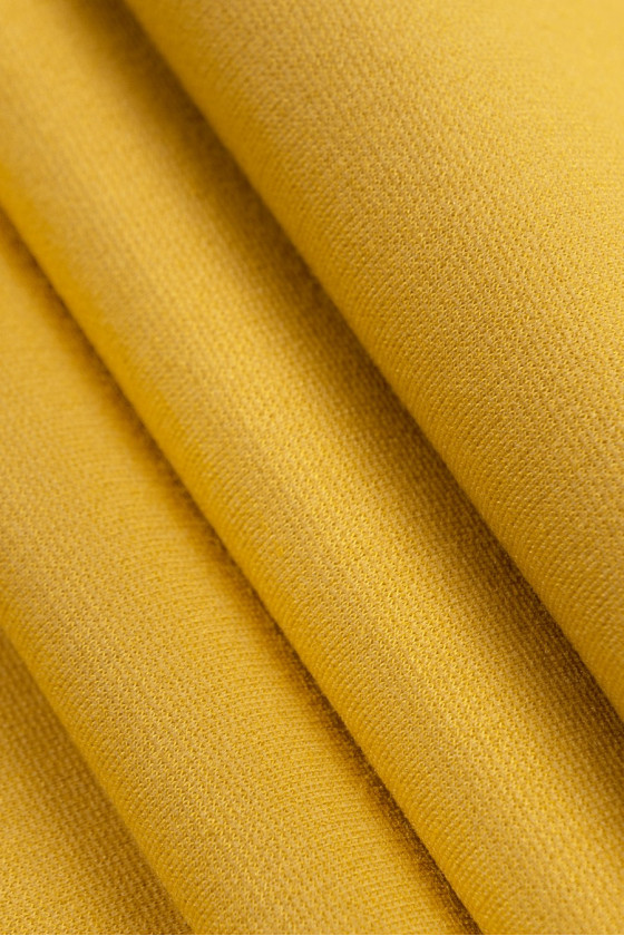 Tessuto a maglia jersey compatto ed elastico di colore giallo sole. Lo consigliamo per cucire abiti comodi: abiti, gonne, tute.