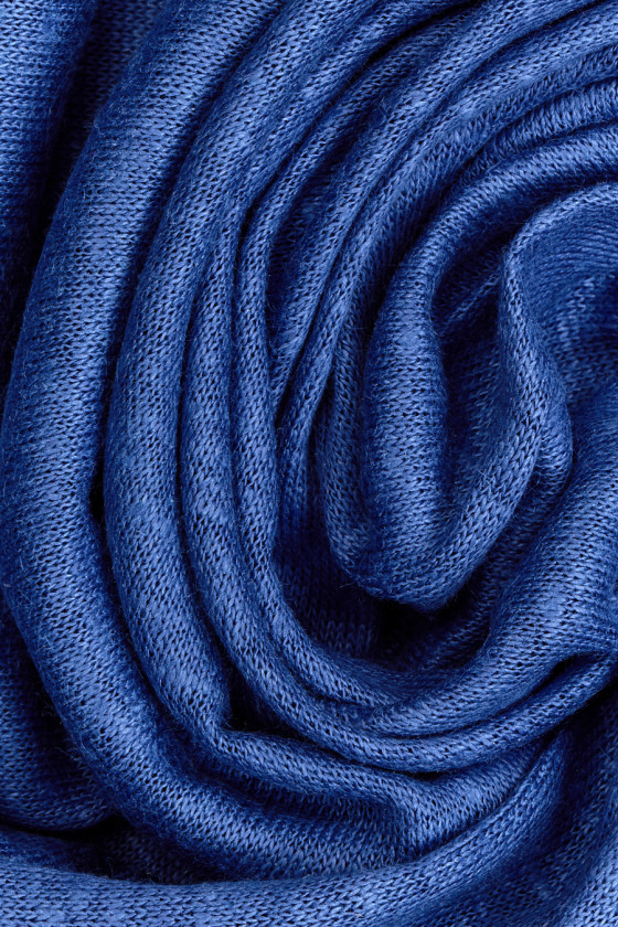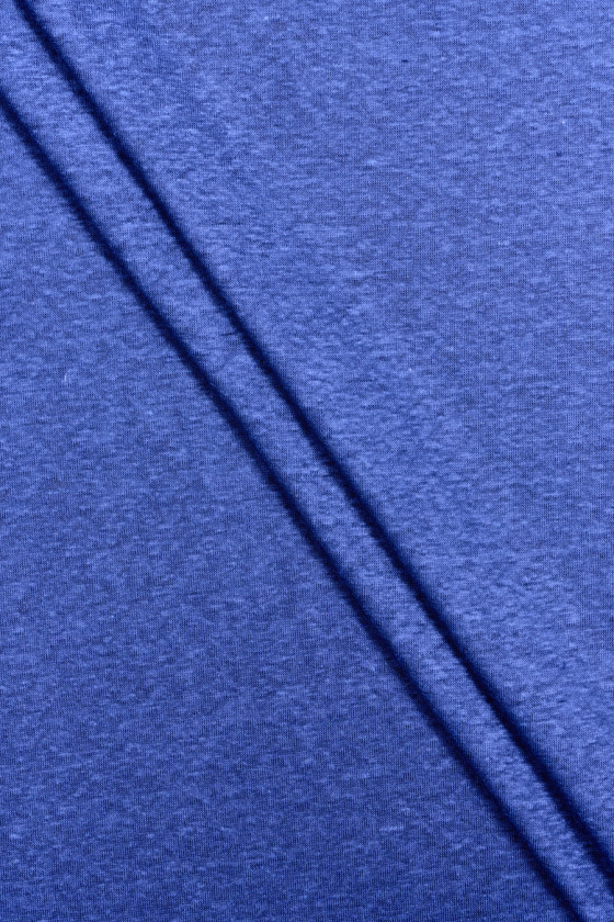 Tessuto italiano a maglia di lino e viscosa blu fiordaliso. Il tessuto a maglia è sottile, morbido, piacevole al tatto, leggermente trasparente ed elastico. Materiale destinato a camicette, magliette, magliette.