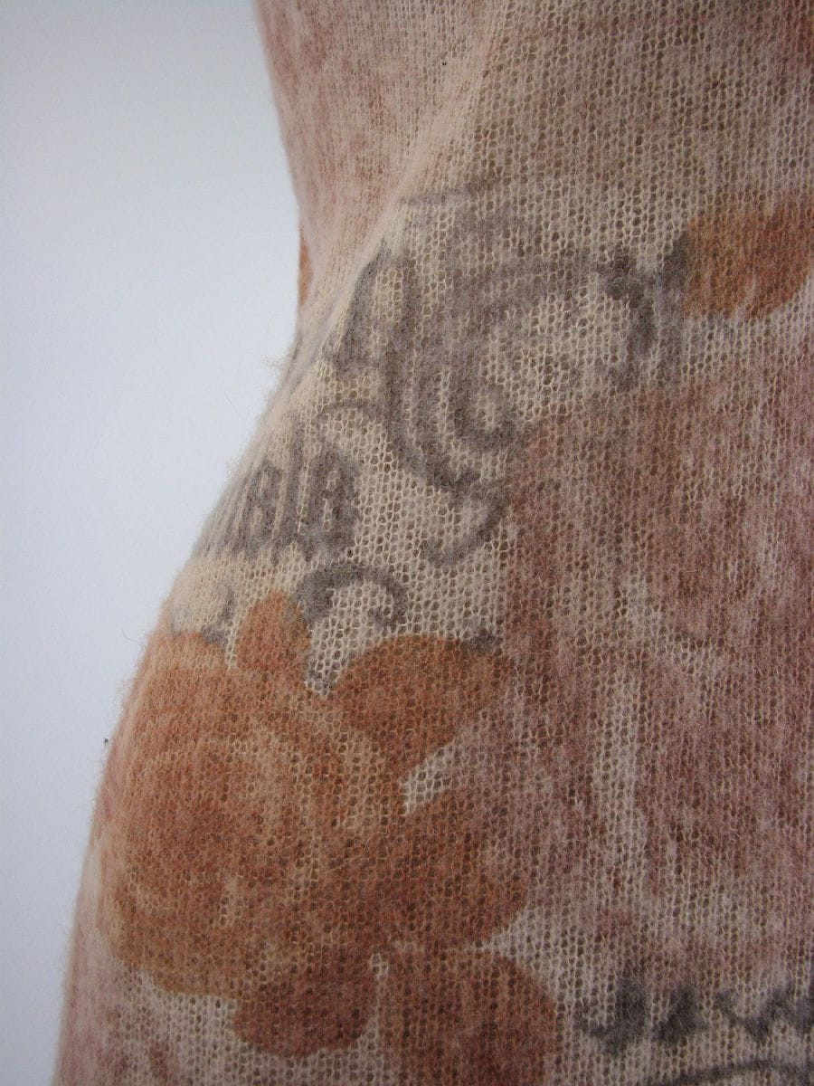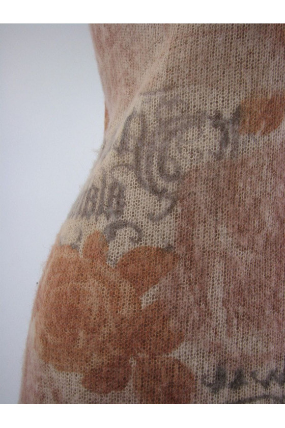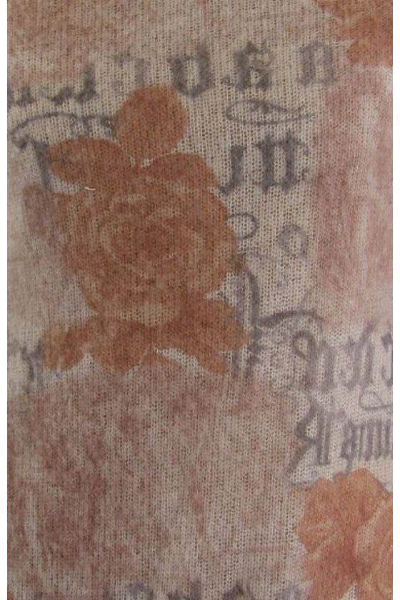 Bellissimo maglione lavorato a maglia intrecciato da un misto lana e acrilico. Il motivo più alla moda: rose e iscrizioni. Perfetto per un maglione o un vestito.
