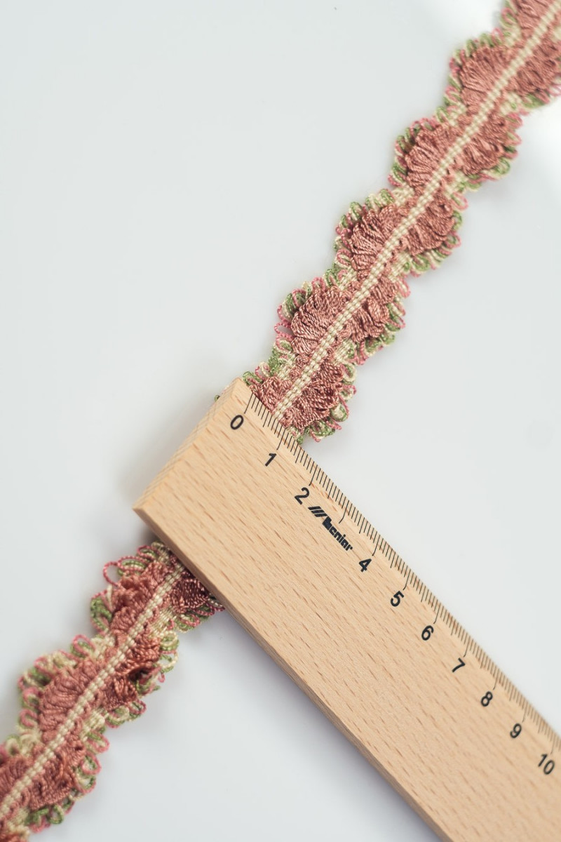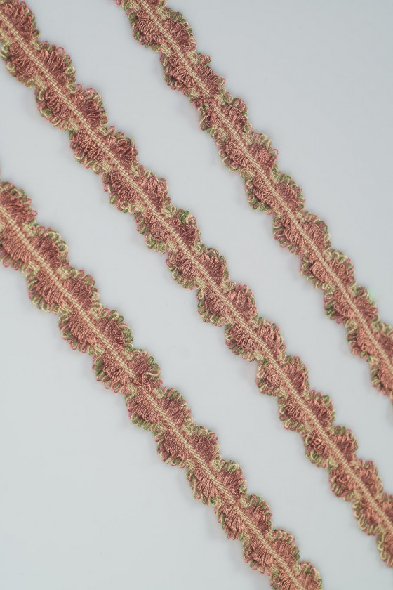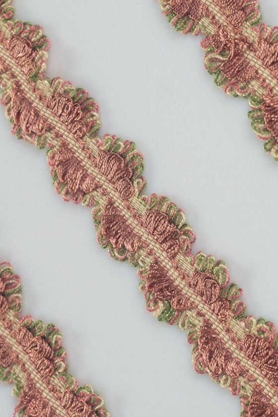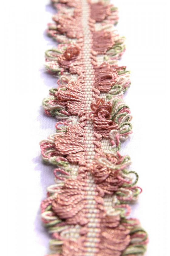 Nastro per merceria in colore rosa sporco e pistacchio, perfetto per rifinire i vestiti. La larghezza del nastro è di 2 cm.